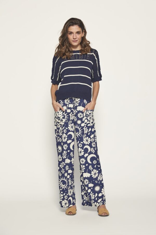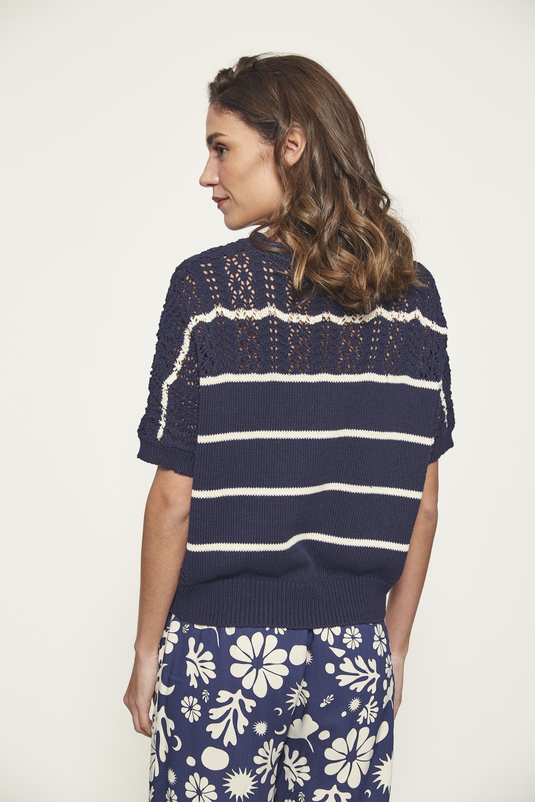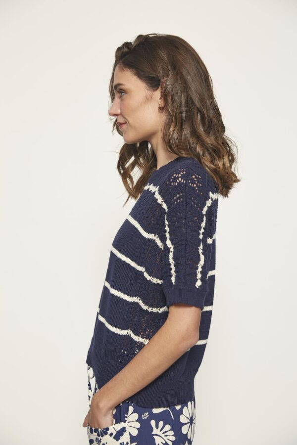 Jersey de rayas de manga corta confeccionado en 100% algodón con detalles de calado intrincado. Color marino