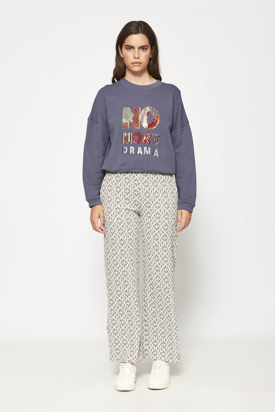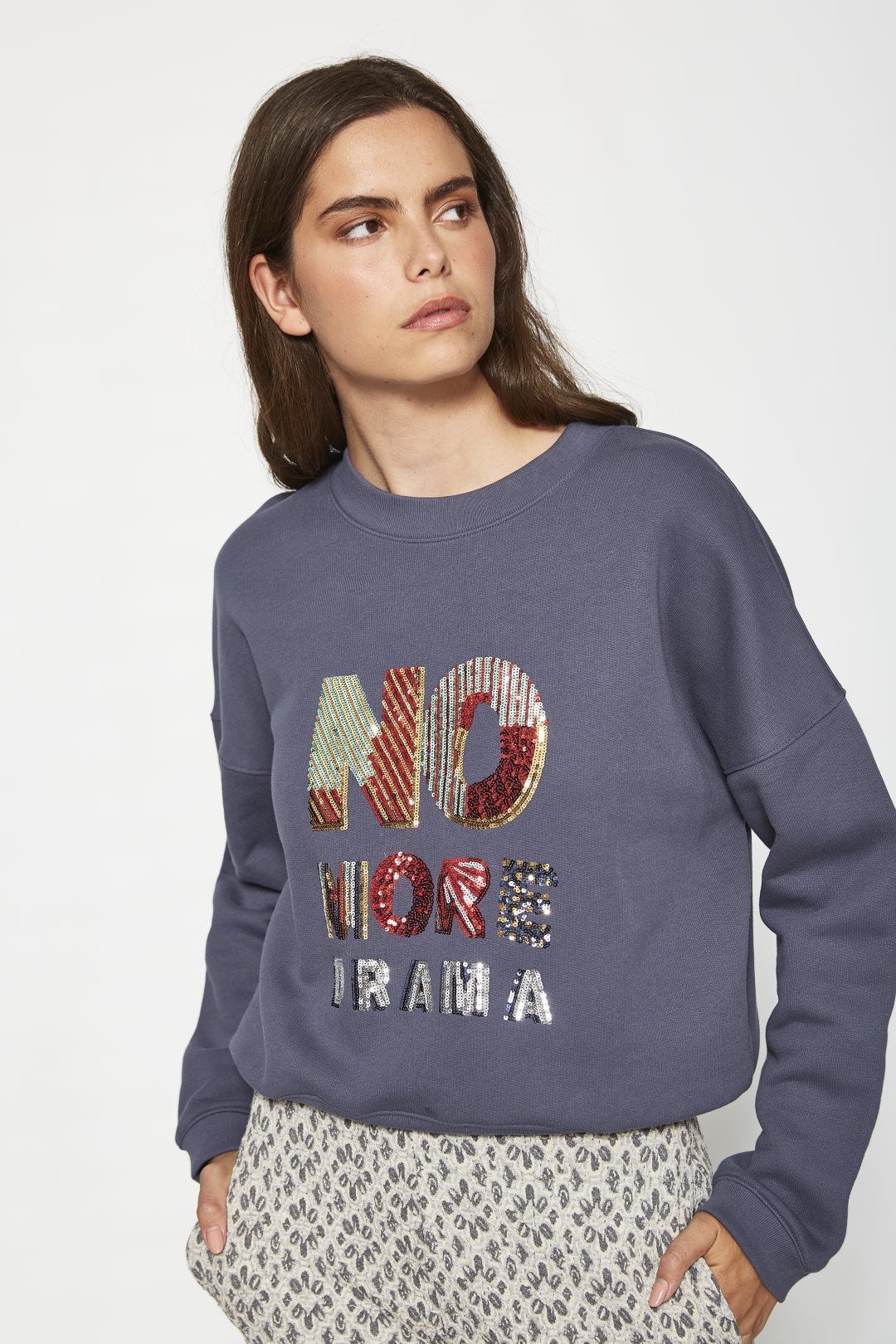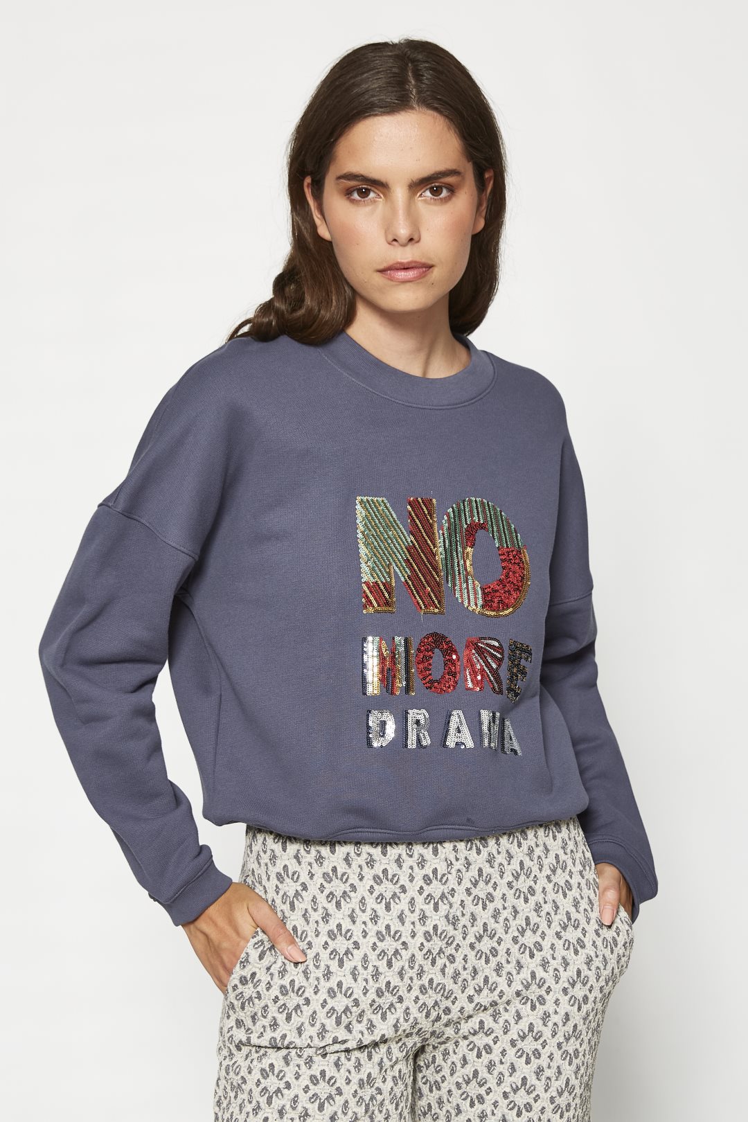 Sudadera de mujer de la colección otoño-invierno de MD’M. Confeccionada en 100% algodón, presenta cuello redondo y manga larga. Destaca por su bordado de lentejuelas con el mensaje “No More Drama” en la parte frontal, que aporta un detalle visual brillante y moderno. Prenda cómoda y actual para looks informales. Disponible en varias tallas.