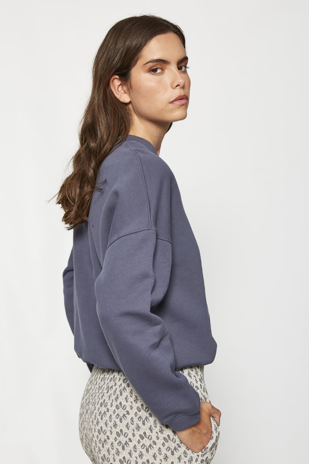 Sudadera de cuello redondo con mangas largas y hombro caído. Puños y bajo acanalados. Estampado frontal con texto decorado con lentejuelas para un efecto brillante y texturizado. Silueta de corte relajado. Color azul