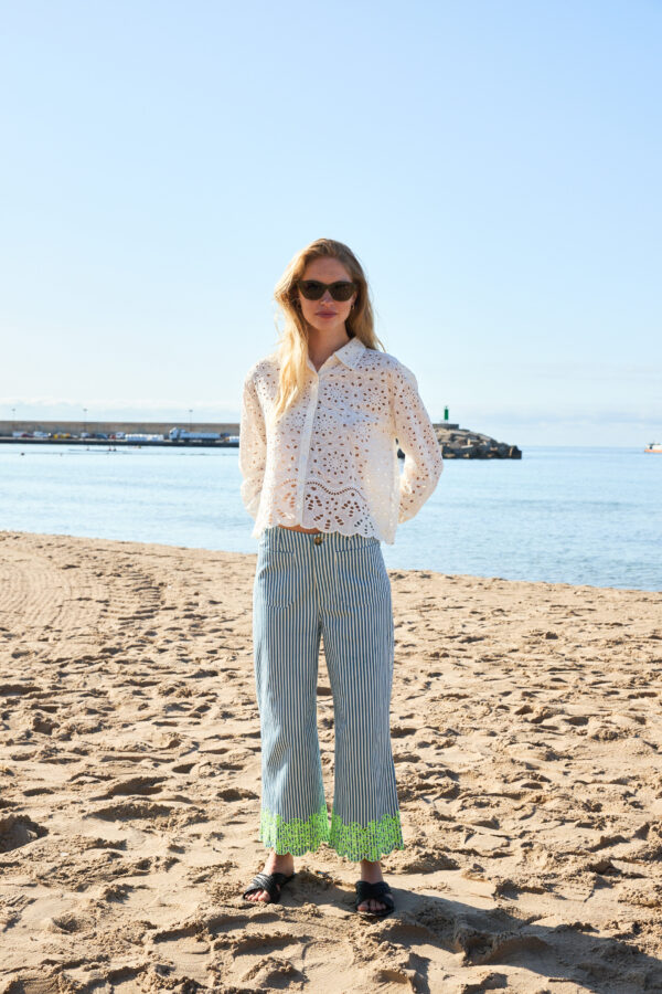 Dale un aire fresco y elegante a tu look con este pantalón de estilo marinero. Con rayas horizontales y un bordado de contraste en verde lima en el bajo, este diseño único es perfecto para la temporada primavera-verano. Ideal para combinar con blusas, camisas o incluso prendas más casuales, aportando un toque divertido y moderno a tu estilo diario. Perfecto para cualquier ocasión, desde un paseo por la ciudad hasta una reunión más informal con amigos.
