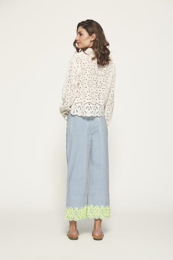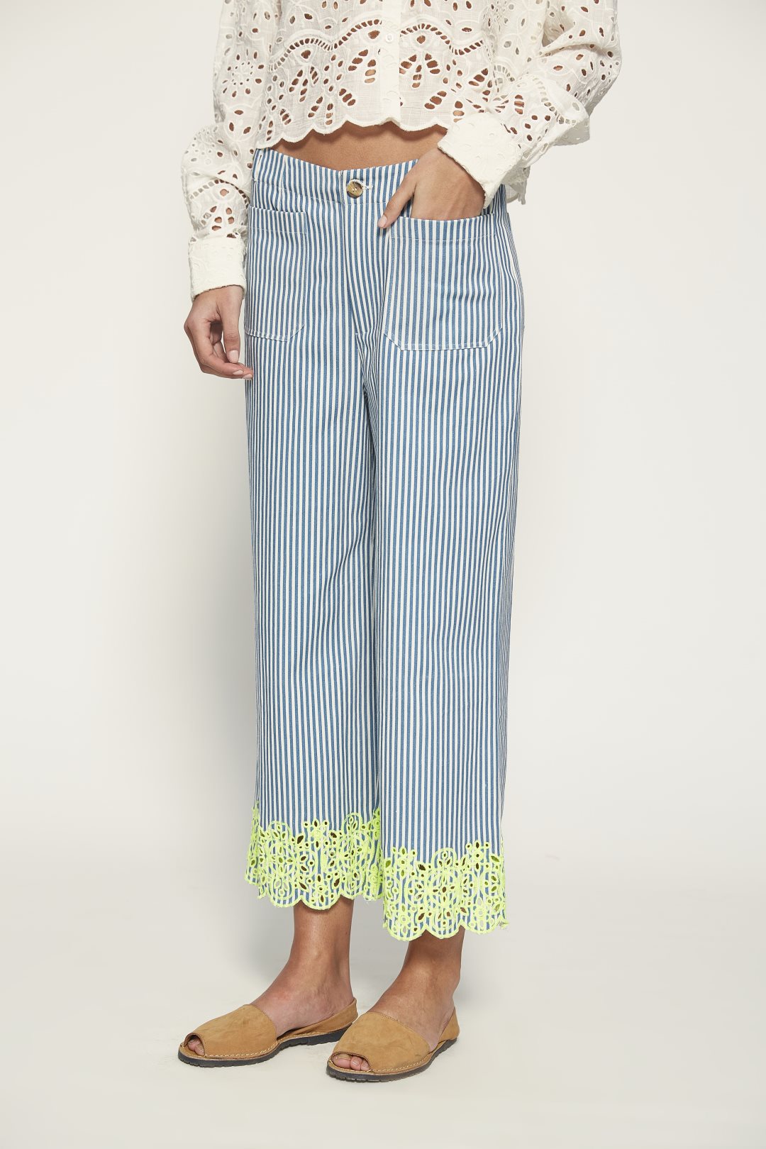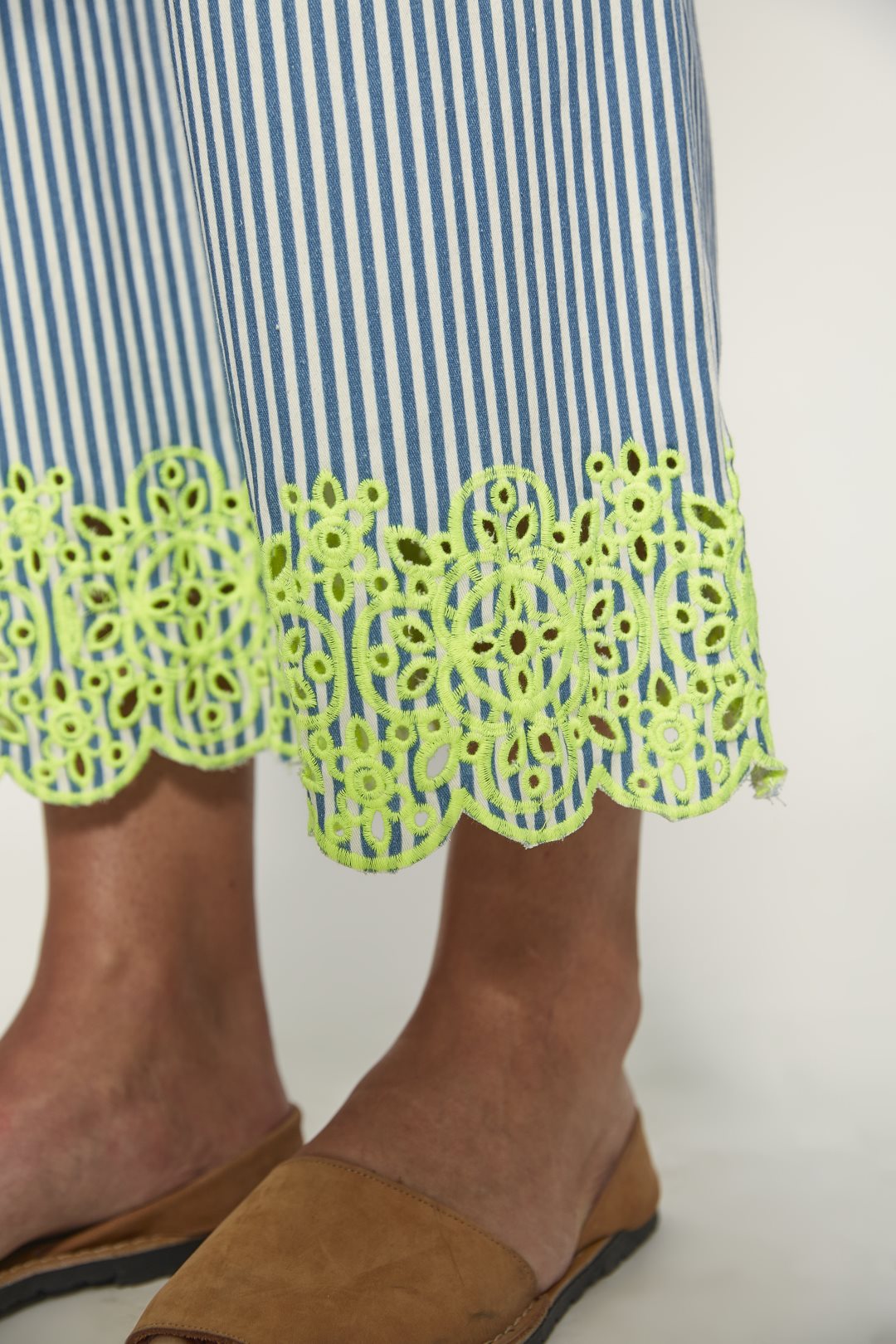 Dale un aire fresco y elegante a tu look con este pantalón de estilo marinero. Con rayas horizontales y un bordado de contraste en verde lima en el bajo, este diseño único es perfecto para la temporada primavera-verano. Ideal para combinar con blusas, camisas o incluso prendas más casuales, aportando un toque divertido y moderno a tu estilo diario. Perfecto para cualquier ocasión, desde un paseo por la ciudad hasta una reunión más informal con amigos.