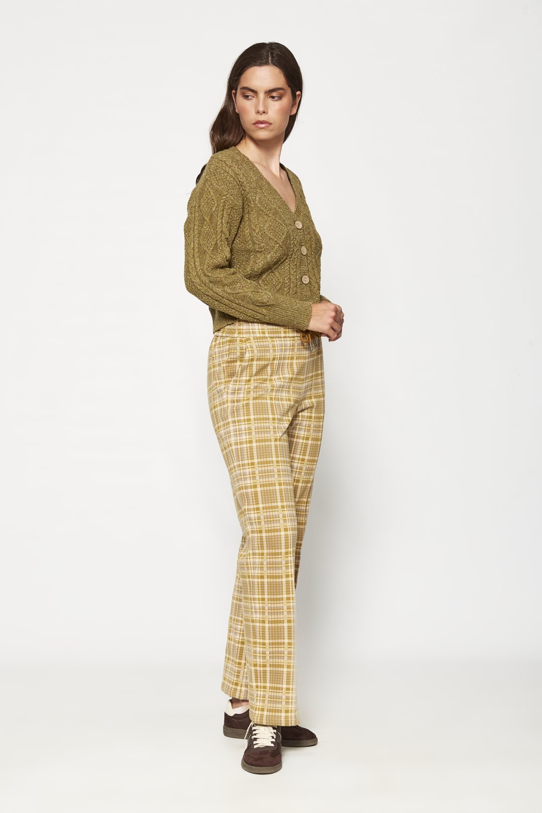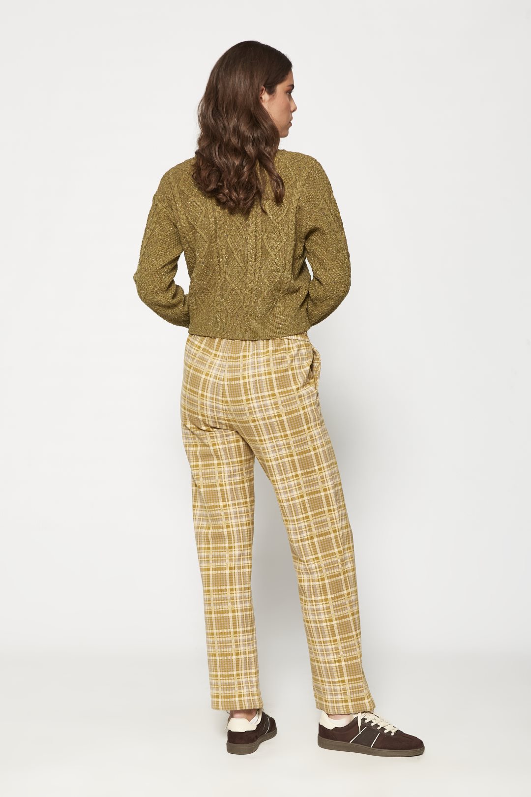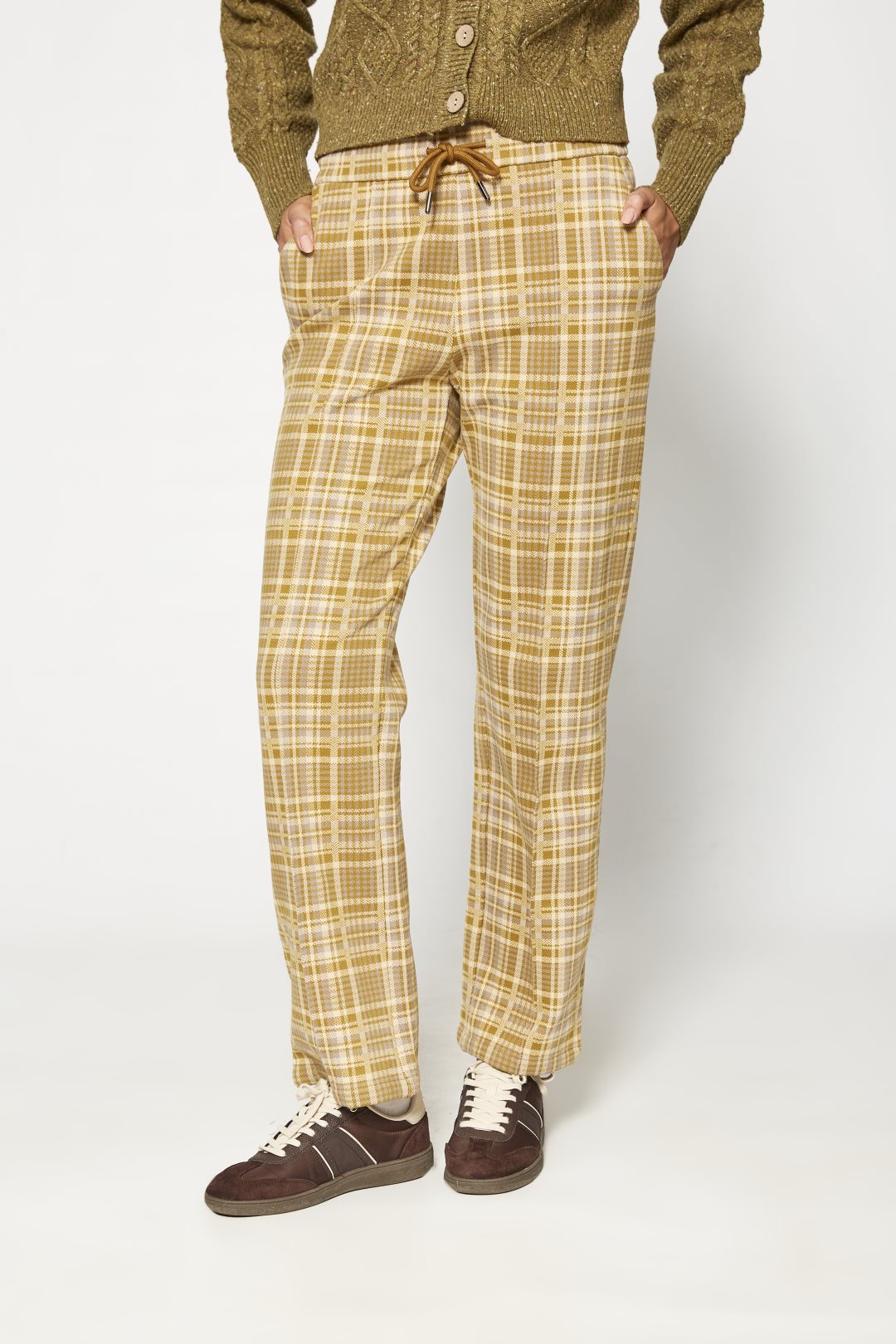 Pantalón para mujer de la colección otoño-invierno de MD’M. Confeccionado en tejido con estampado de cuadros tipo tartán en tonos tierra y grises, presenta un corte recto o ligeramente tapered que ofrece una silueta relajada y definida. La cintura es elástica y ajustable mediante cordón de tono neutro, aportando confort y un toque casual deportivo. Diseño sin presillas para cinturón, que refuerza la estética híbrida entre lo deportivo y lo formal. Ideal para looks modernos y versátiles. Disponible en varias tallas.