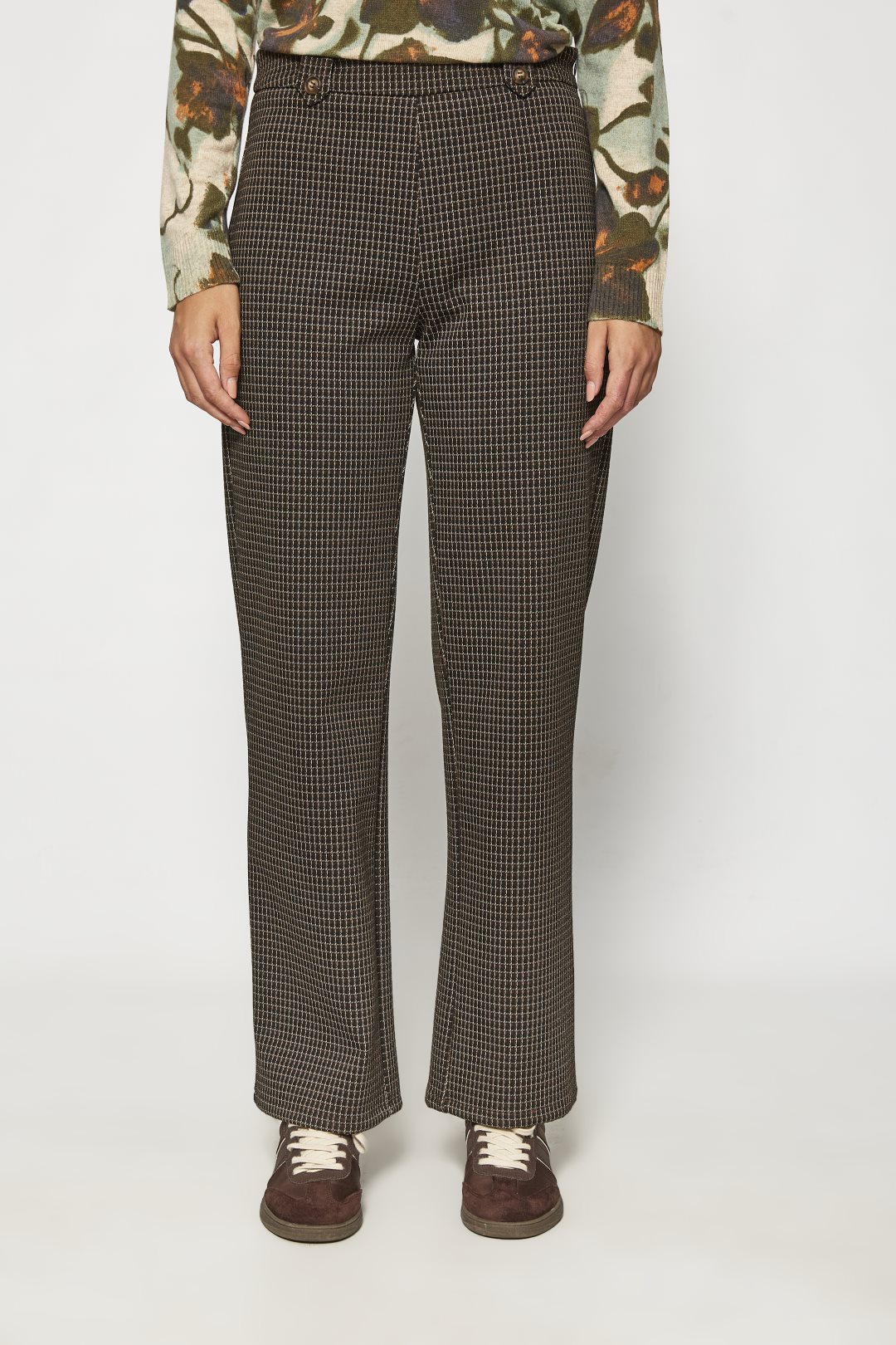 Pantalón para mujer de la colección otoño-invierno de MD’M. Confeccionado en tejido con patrón clásico de pata de gallo en tonos bicolor, presenta un corte recto o ligeramente entallado y cropped, terminando al tobillo para un look moderno y pulido. La cintura es lisa y estructurada, equipada con presillas para cinturón. Destaca el cierre con cremallera lateral oculta que aporta un acabado limpio y sofisticado. Pinzas delanteras sutiles y costuras definidas aportan estructura y ajuste a la prenda. Diseño sofisticado y atemporal, ideal para estilismos formales. Disponible en varias tallas.