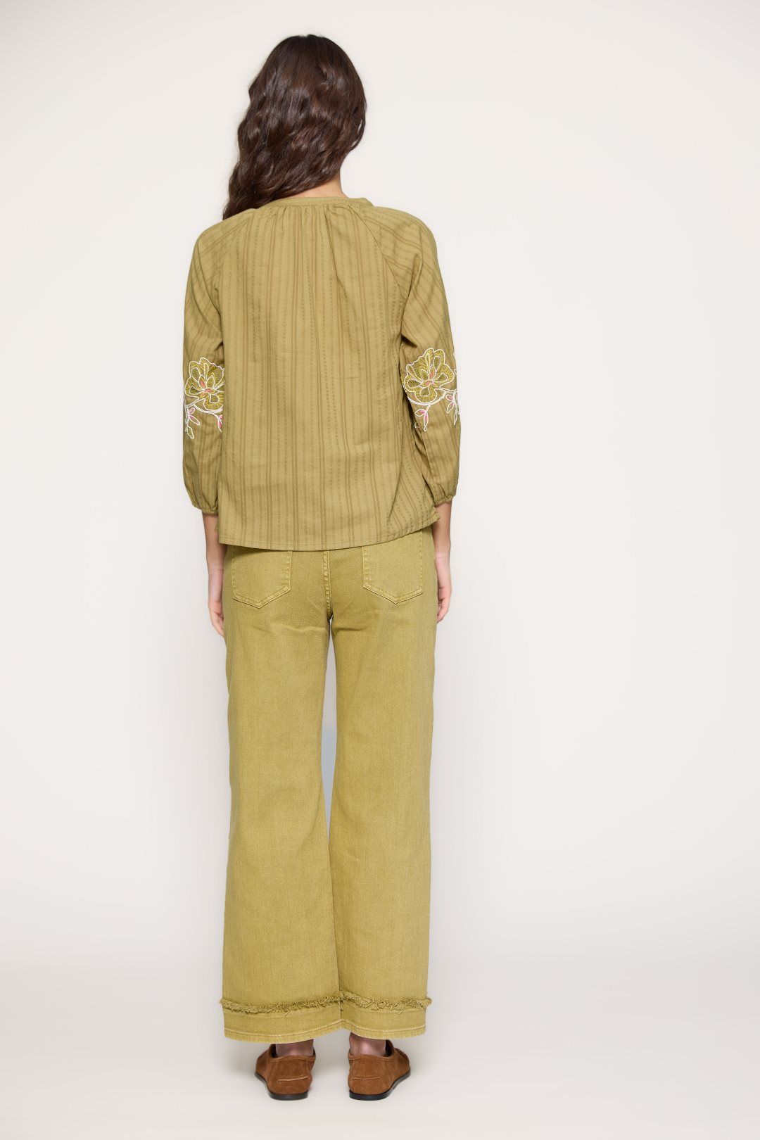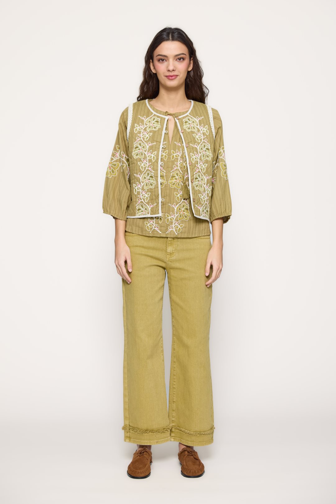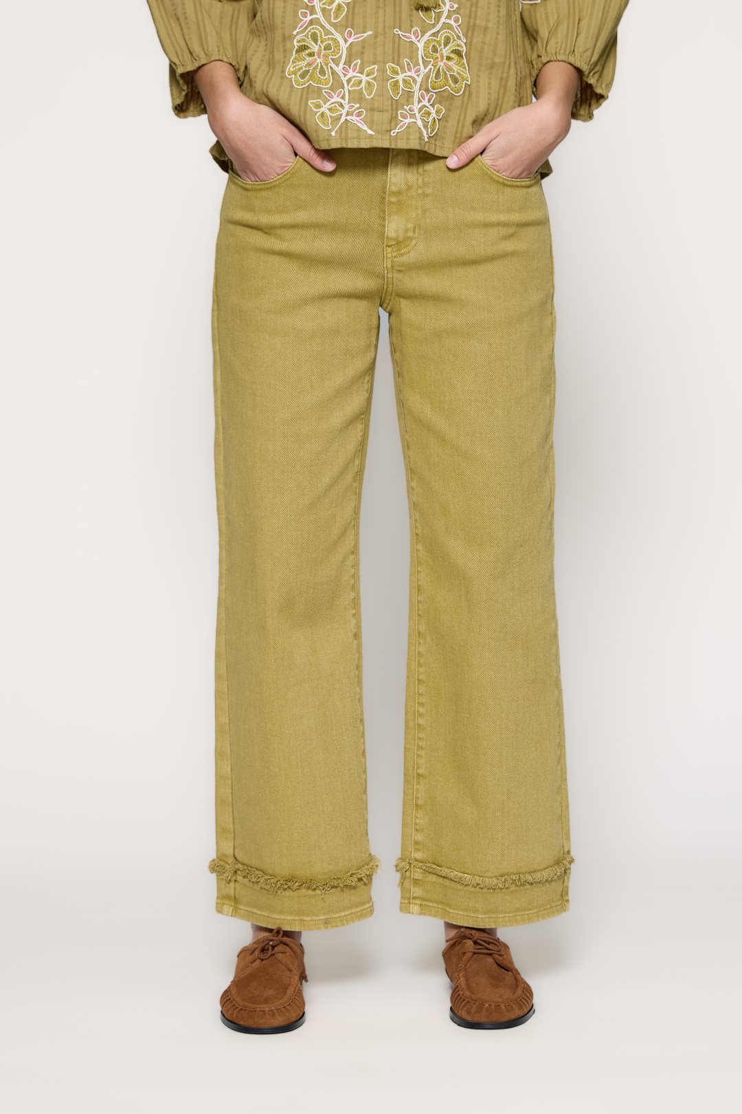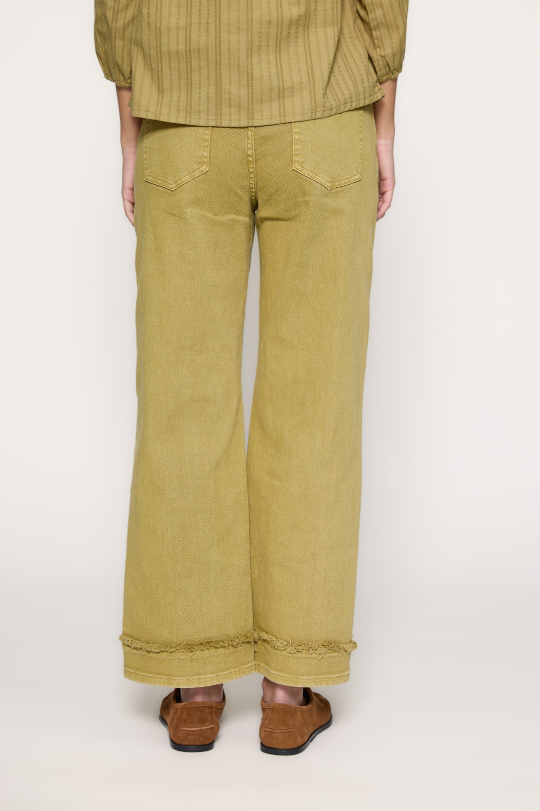 Pantalón largo de corte recto confeccionado en algodón con elastano. Cintura con trabillas, cierre de botón y cremallera, bolsillos de cinco piezas y bajo acabado con desflecado. Color caqui