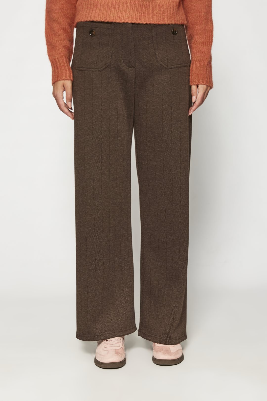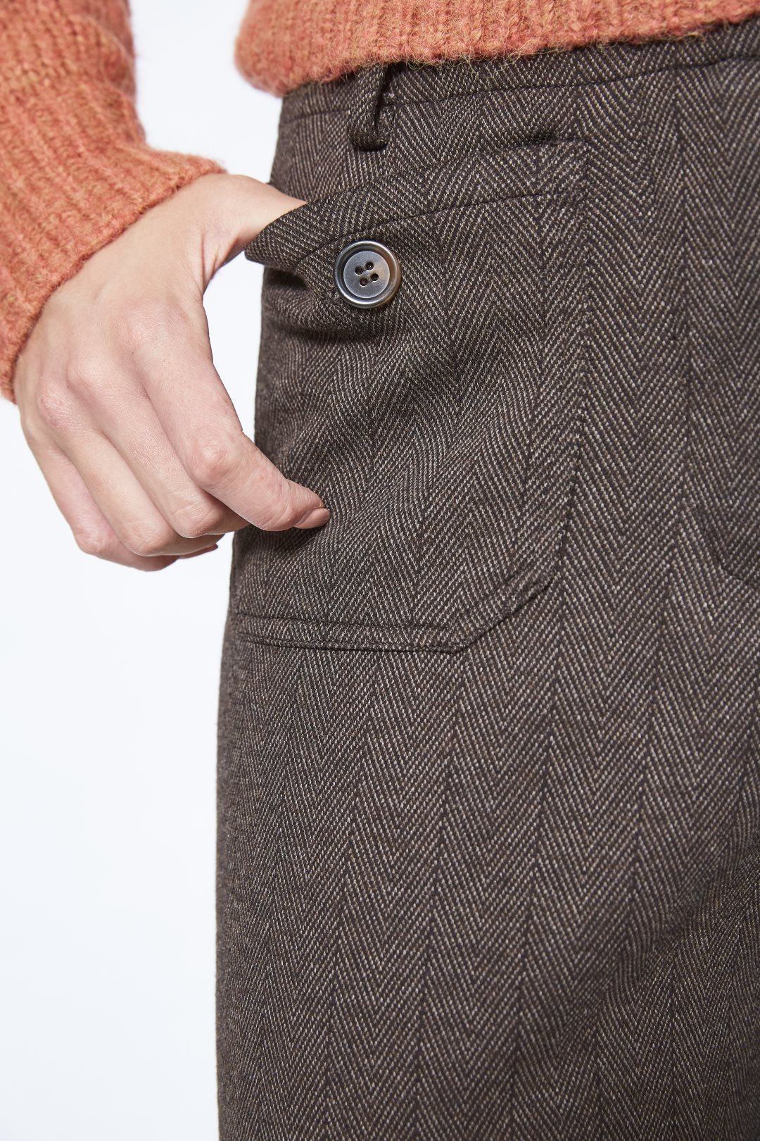 Pantalón largo de tejido en espiga con detalle de botones decorativos, estilo marine. Color marrón