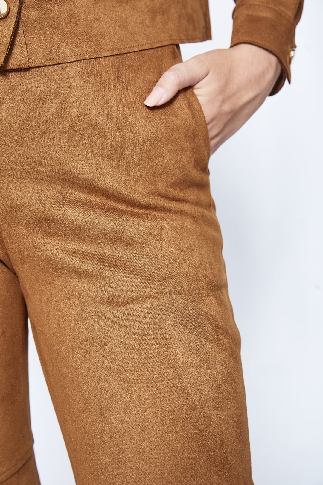 Pantalón slim fit cropped en tejido suave con acabado aterciopelado, cintura lisa y costuras horizontales en la parte inferior. Color marrón