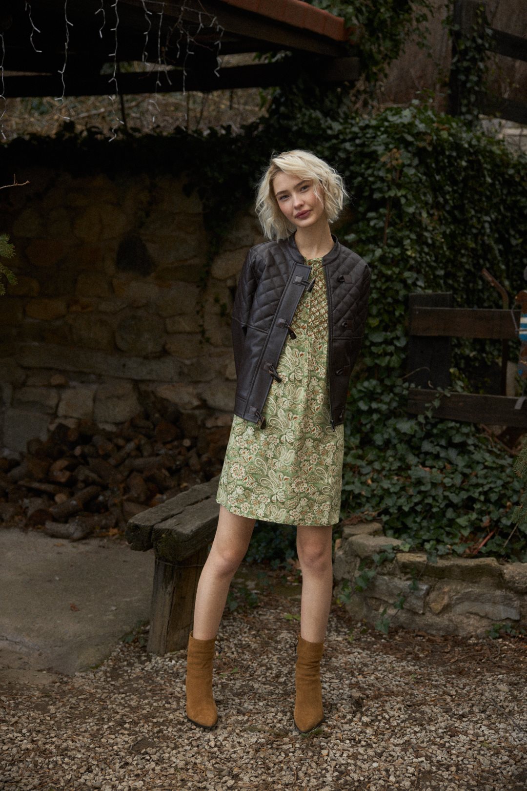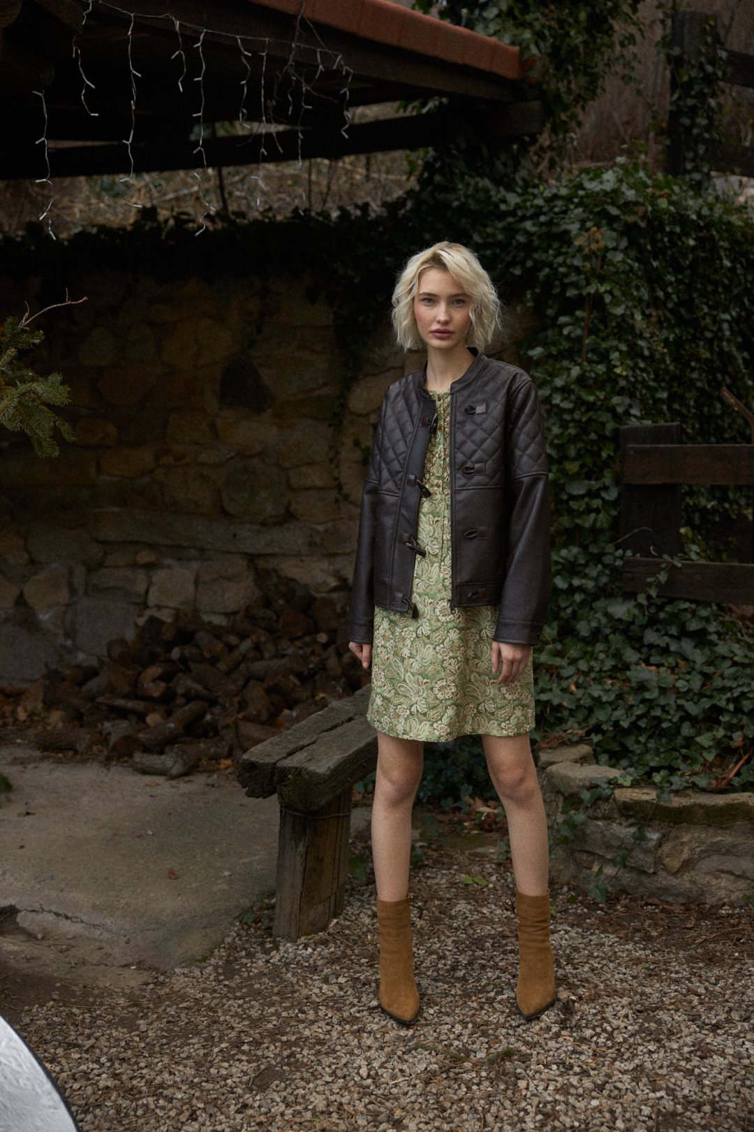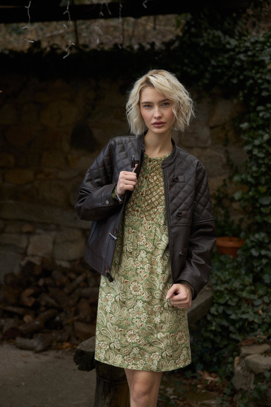Cazadora corta efecto piel, con detalles acolchados en rombos en la parte superior y cierre de botones de trenca. Diseño de cuello redondo y manga larga con ajuste en puños. Color marrón