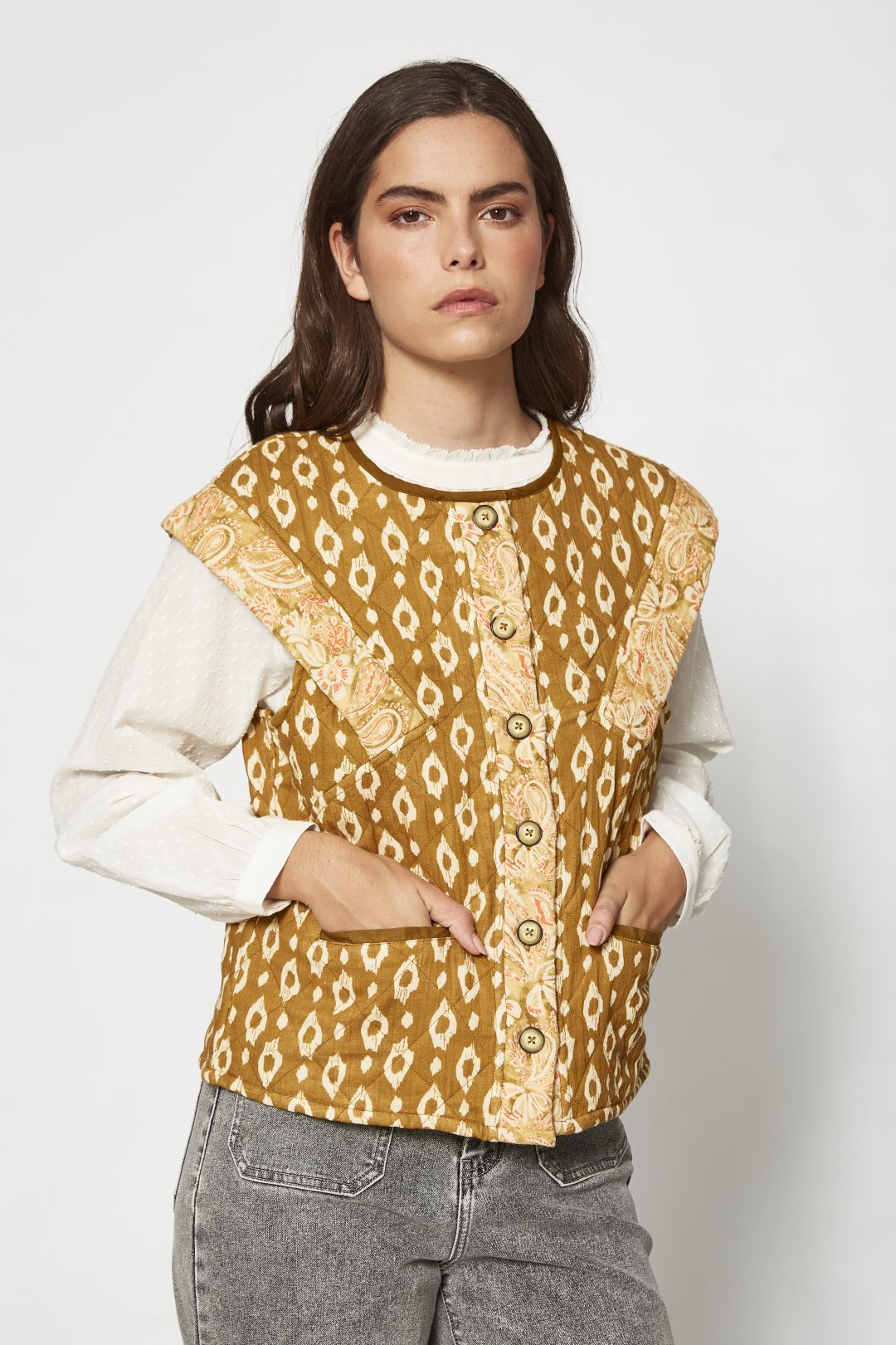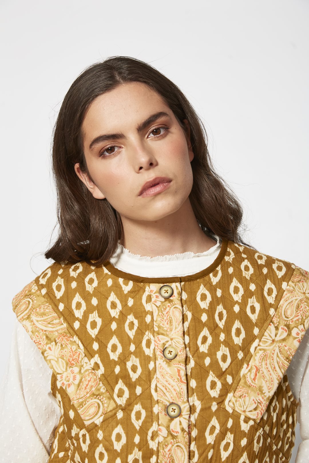 Chaleco ligero para mujer de la colección otoño-invierno de MD’M. Confeccionado en tejido acolchado con textura abullonada y corte recto holgado. Presenta un estampado principal ikat combinado con detalles en estampado floral o paisley en el ribete del cuello, tapeta de botones y hombros. Cierre frontal con botones redondos y dos bolsillos de parche ribeteados. Prenda funcional y estilosa, ideal para capas intermedias. Disponible en varias tallas.