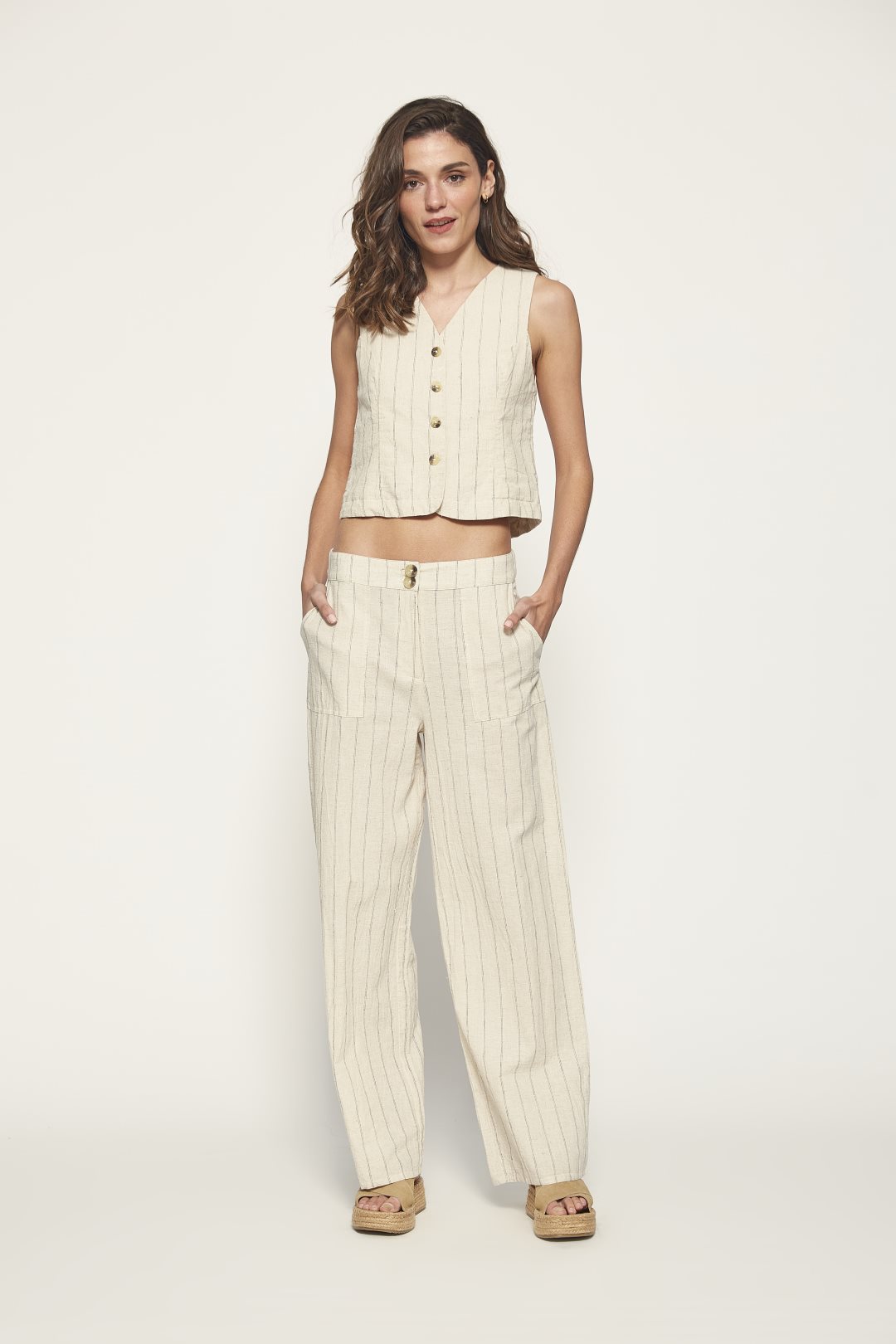 Este chaleco de rayas es una pieza imprescindible para tu colección de primavera-verano. Su escote en pico y el bajo redondeado crean una silueta favorecedora y elegante. Está confeccionado con una mezcla ligera y cómoda de lino y algodón, proporcionando frescura durante los días más cálidos. Su diseño atemporal y su versatilidad lo convierten en el complemento perfecto para cualquier conjunto, desde un look casual hasta uno más sofisticado. Ideal para disfrutar del estilo y la comodidad en cualquier ocasión.
