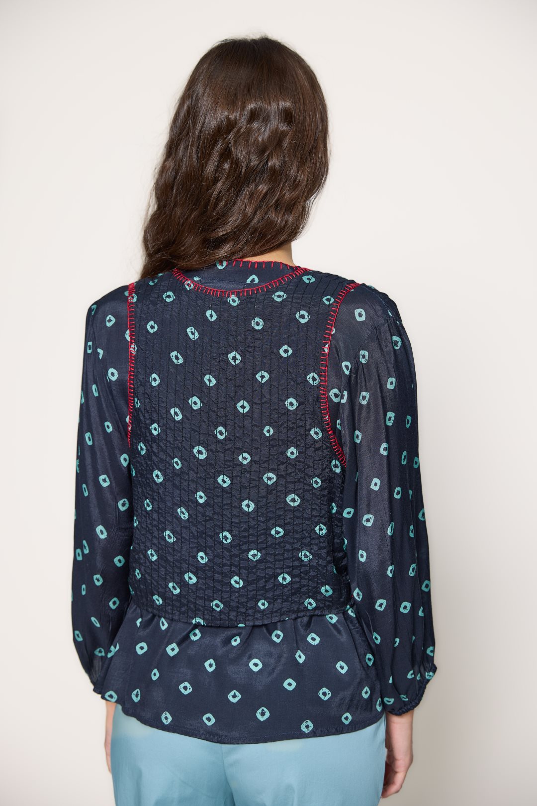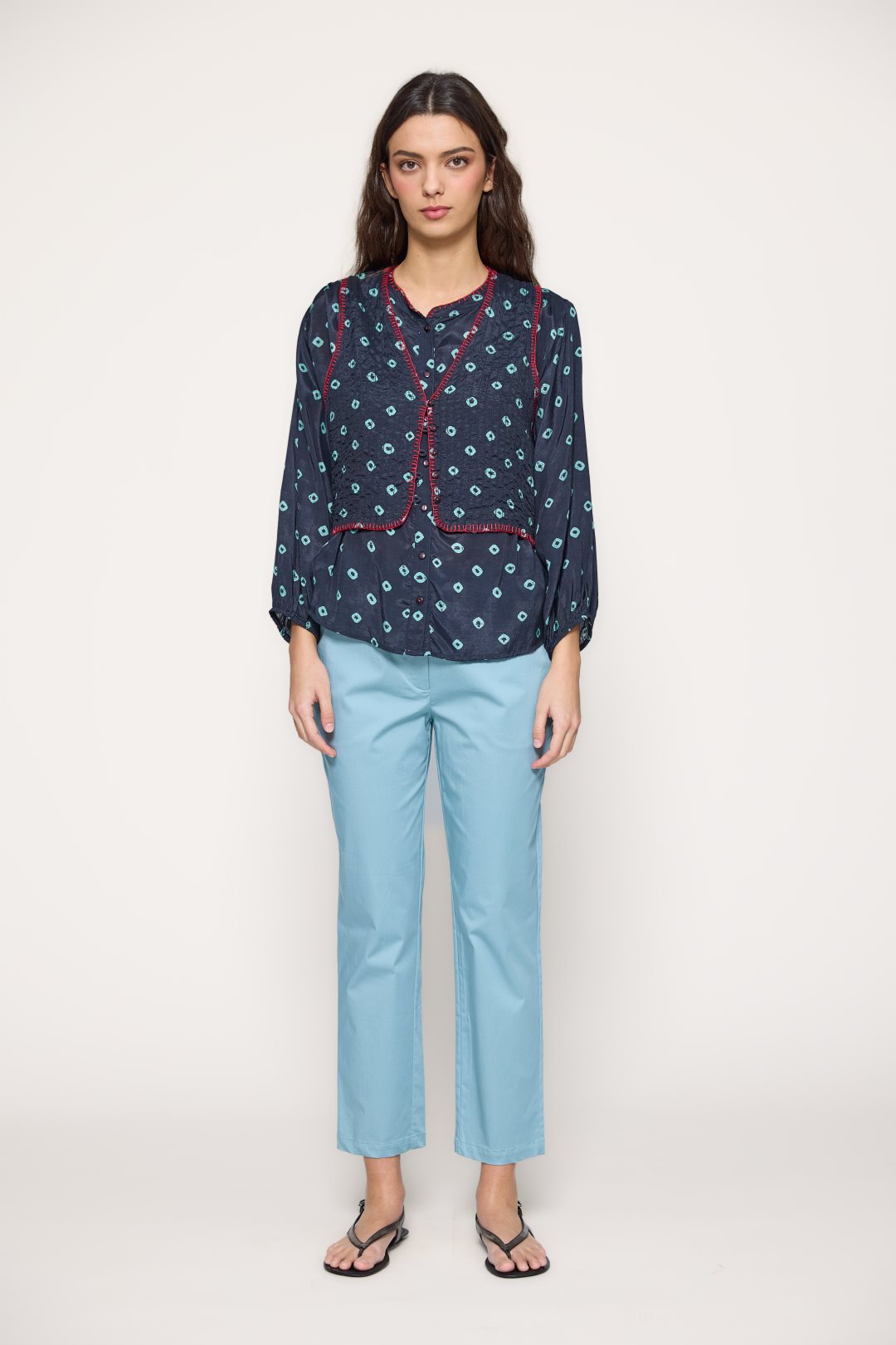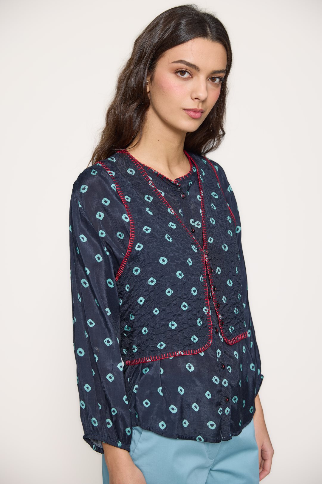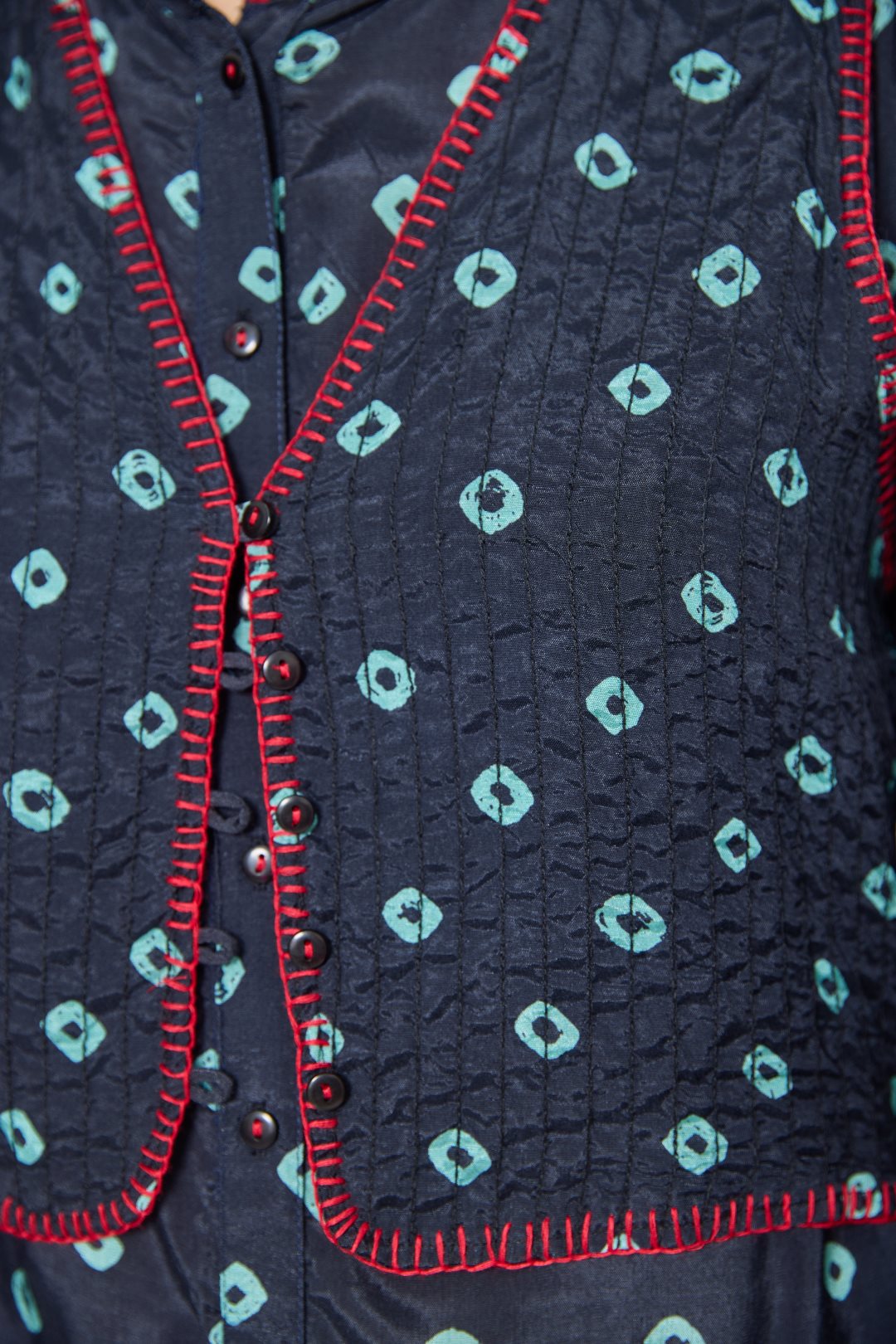 Chaleco de escote en pico con cierre de botones en el delantero. Presenta estampado geométrico y pespuntes decorativos en contraste que aportan un aire artesanal. Color marino