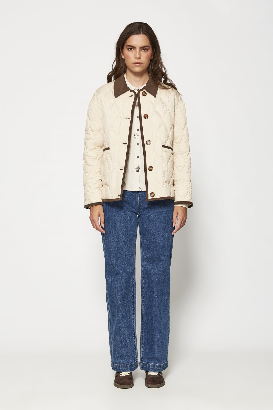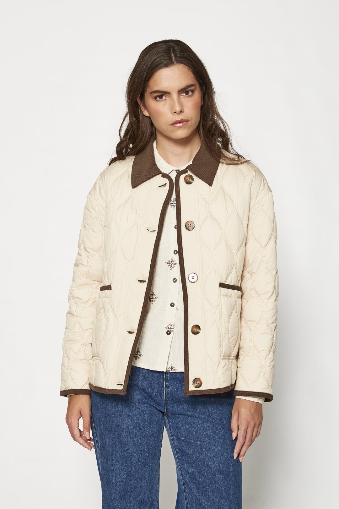 Chaqueta para mujer de la colección otoño-invierno de MD’M. Diseño casual de corte recto y silueta holgada, con largo hasta la cadera. Confeccionada en tejido técnico con acolchado ligero, formando un patrón de rombos u ondas que aporta textura visual y volumen. Incorpora un cuello clásico de tejido acanalado o pana, que contrasta con el cuerpo principal y refuerza su estilo informal. El cierre frontal se realiza mediante una hilera de botones redondos, de aspecto natural, sobre tapeta ribeteada con una banda de material liso y en color a contraste. Las mangas largas presentan un corte cómodo, terminadas en puños sencillos. Cuenta con dos bolsillos de parche delanteros grandes y cuadrados, también ribeteados con el mismo acabado del cierre. Prenda cálida y práctica para looks de entretiempo o días fríos. Disponible en varias tallas.