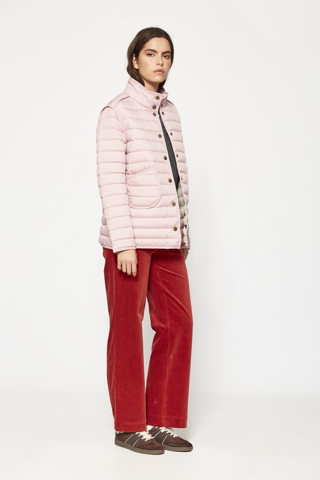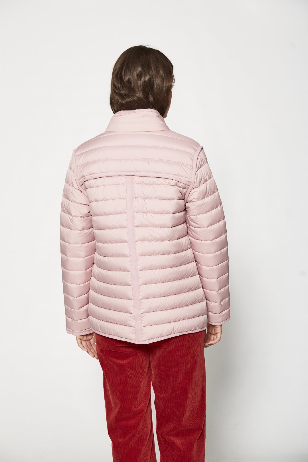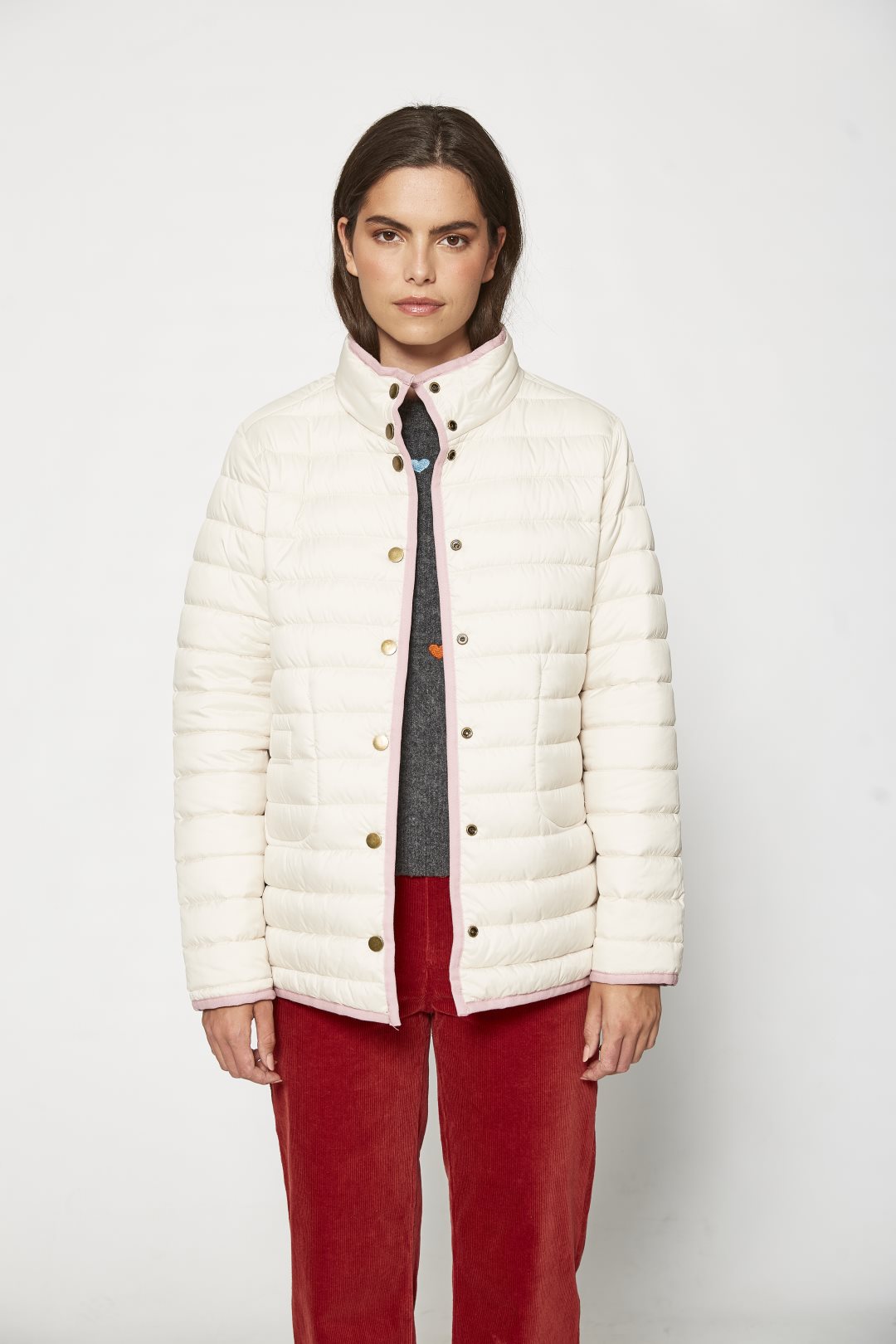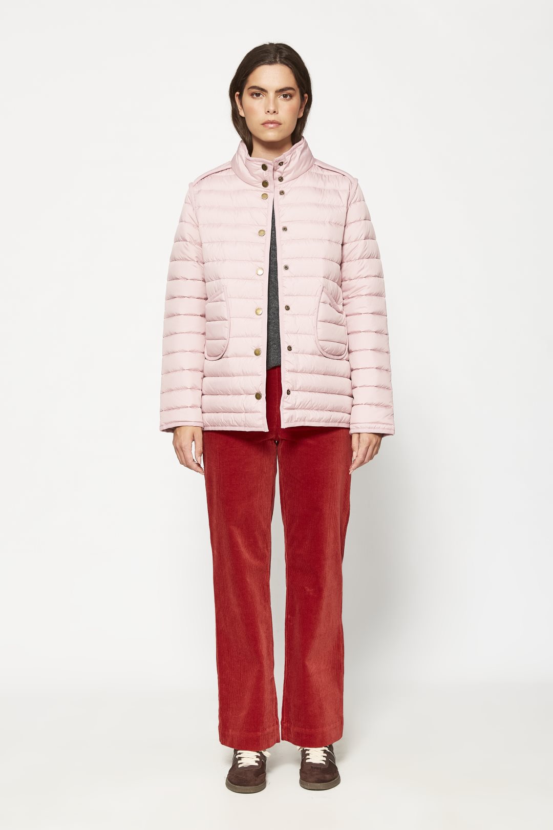 Chaqueta ligera acolchada de corte recto y cuello mao, con cierre de botones, bolsillos de parche y diseño reversible con dos acabados distintos. Color rosa