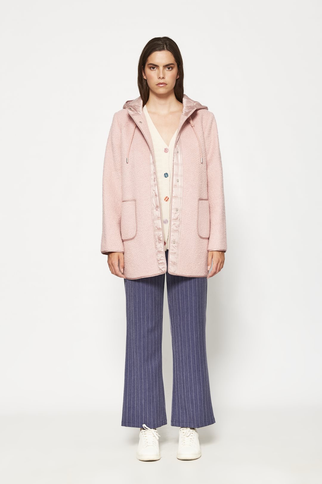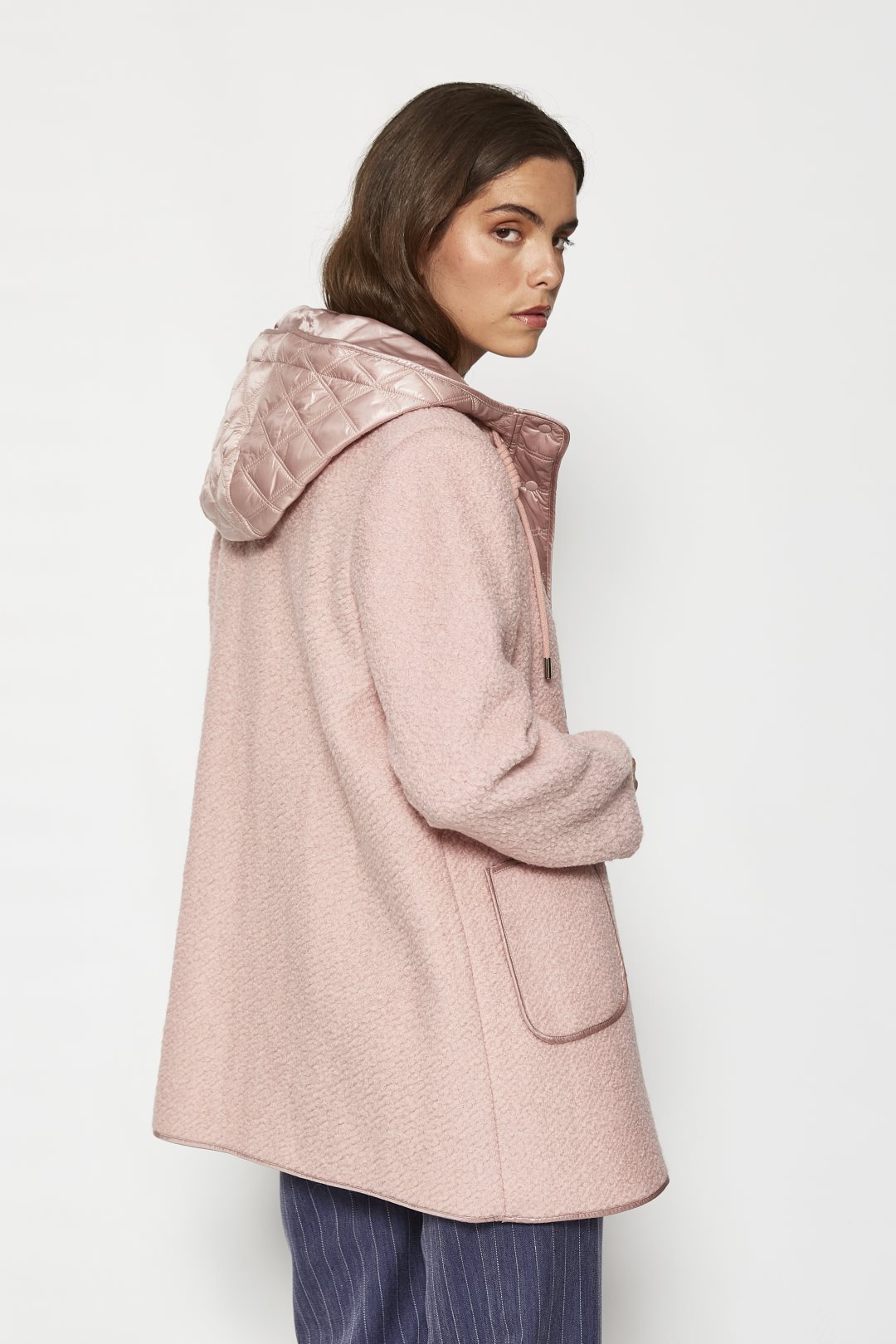 Chaqueta para mujer de la colección otoño-invierno de MD’M. Diseño corto con corte recto y holgado que alcanza la cadera o mitad del muslo, combinando texturas para un estilo actual y funcional. El cuerpo y las mangas están confeccionados en tejido de rizo o bouclé, mullido y suave con relieve tipo lana de borrego. La tapeta frontal y el interior de la capucha son de nylon acolchado con costuras horizontales que crean un patrón de «quilting» con ligero brillo, aportando contraste visual y térmico. La capucha fija incluye cordones ajustables del mismo material que el rizo, con topes metálicos. El cierre principal es de botones redondos sobre la tapeta de nylon. Dispone de dos bolsillos de parche grandes y redondeados en la parte inferior delantera, ribeteados con nylon liso a juego. Bajo y puños sin ribetes para un acabado limpio. Prenda versátil para climas frescos y estilismos urbanos. Disponible en varias tallas.