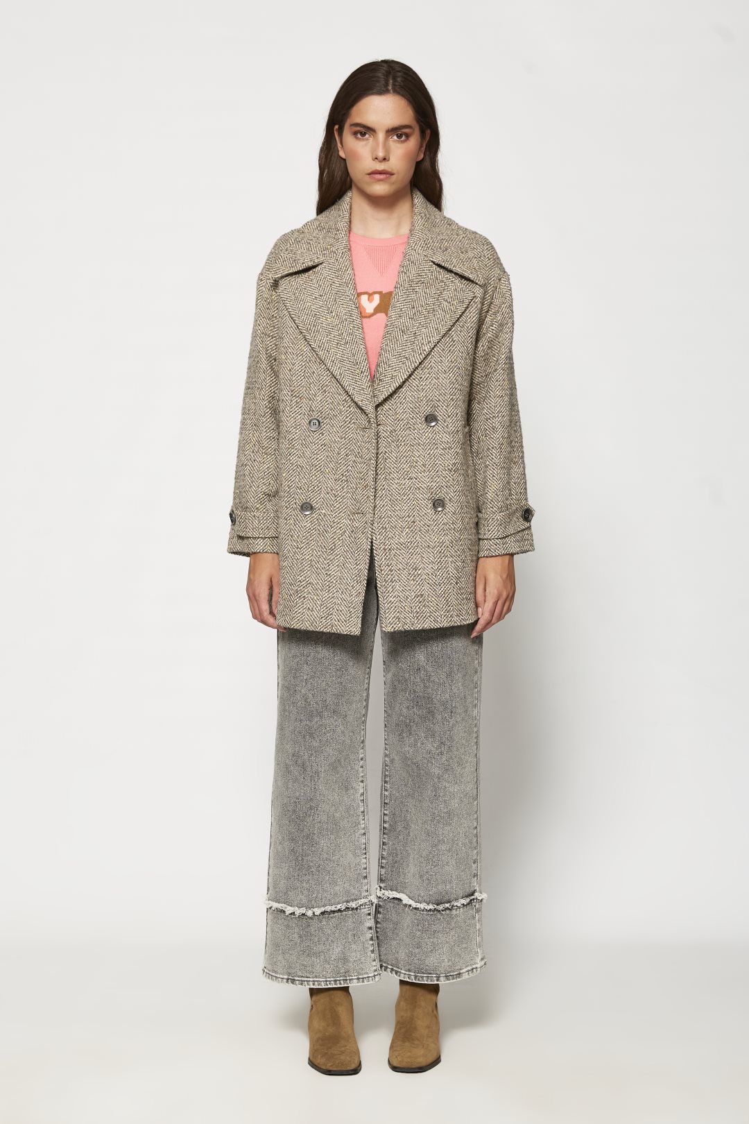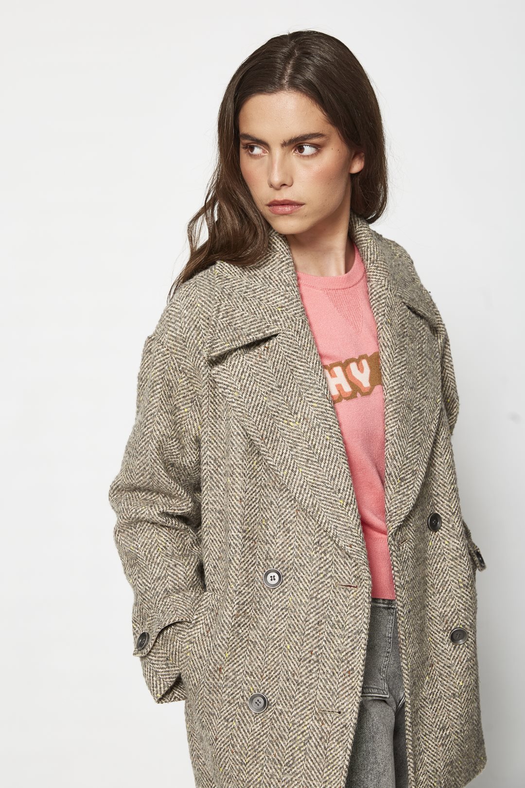 Chaqueta para mujer de la colección otoño-invierno de MD’M. Diseño corto con corte recto y estructura relajada que aporta comodidad sin renunciar al estilo clásico. Confeccionada en tejido con patrón de espiga (herringbone), enriquecido con pequeñas motas en color contrastado que aportan profundidad y textura visual. La composición incluye mezcla de lana, ideal para climas fríos. Presenta cuello de solapa amplio y definido, y cierre delantero con doble botonadura mediante dos hileras de botones redondos de aspecto natural. Las mangas largas tienen un acabado ligeramente holgado y terminan en puños con lengüeta ajustable y botón decorativo. Incorpora dos bolsillos delanteros con solapa a la altura de la cadera, que completan el estilo funcional y clásico de la prenda. Prenda versátil, con inspiración tradicional, perfecta para looks urbanos y de entretiempo. Disponible en varias tallas.