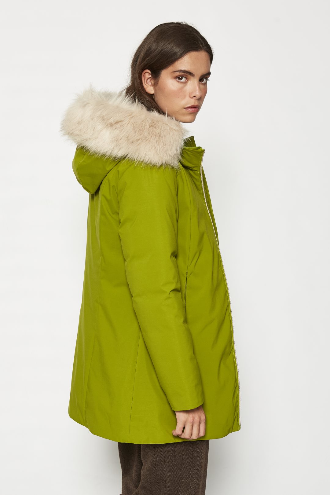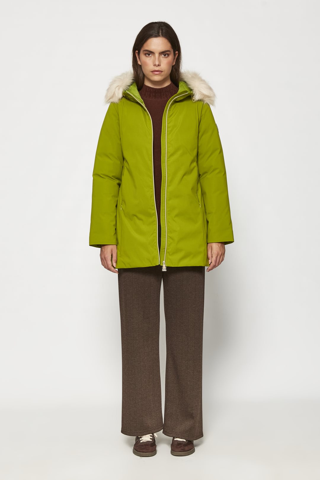 Parka acolchada para mujer de la colección otoño-invierno de MD’M. Confeccionada en tejido técnico impermeable y cortaviento, ideal para climas fríos y lluviosos. Diseño funcional con corte recto y largo tres cuartos, que proporciona una mayor cobertura térmica sin sacrificar comodidad. Cierre central con cremallera bidireccional de alta resistencia, protegida por solapa interior. Incluye capucha integrada con ribete de pelo sintético desmontable en tono contrastado. Relleno térmico interior que garantiza aislamiento y ligereza. Dos bolsillos laterales con cierre de cremallera oculta para mayor seguridad. Manga larga con acabado recto. Una prenda cálida, práctica y versátil, diseñada para el día a día urbano en invierno. Disponible en varias tallas.