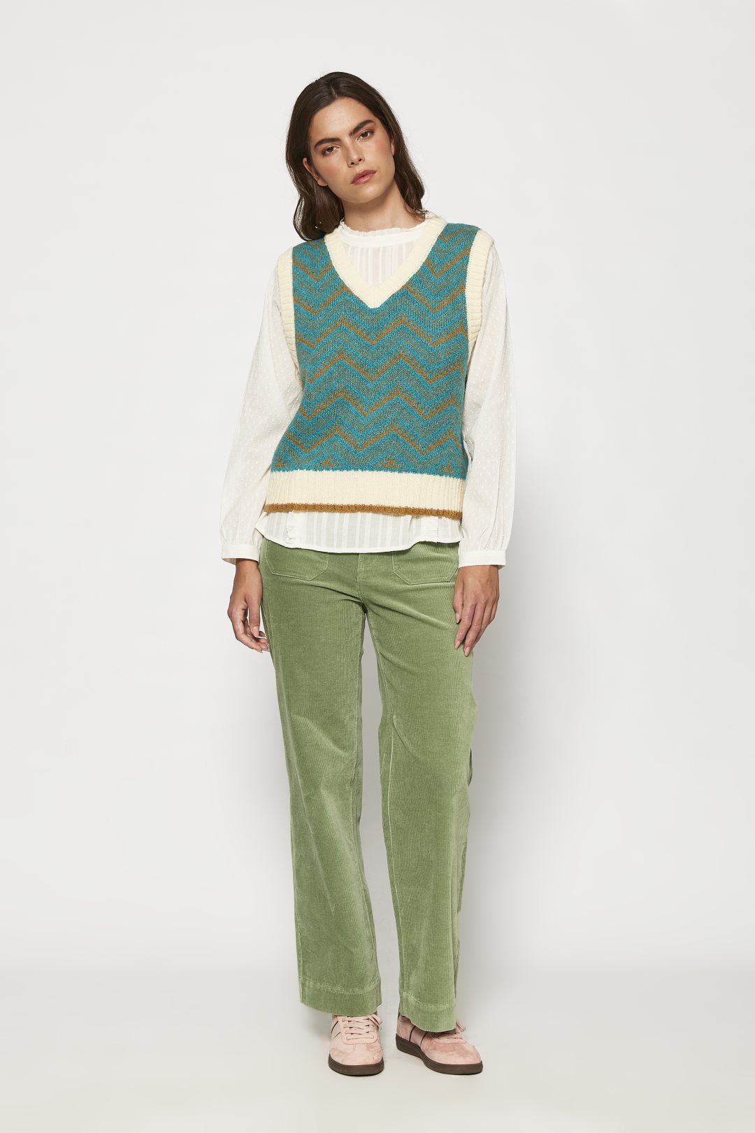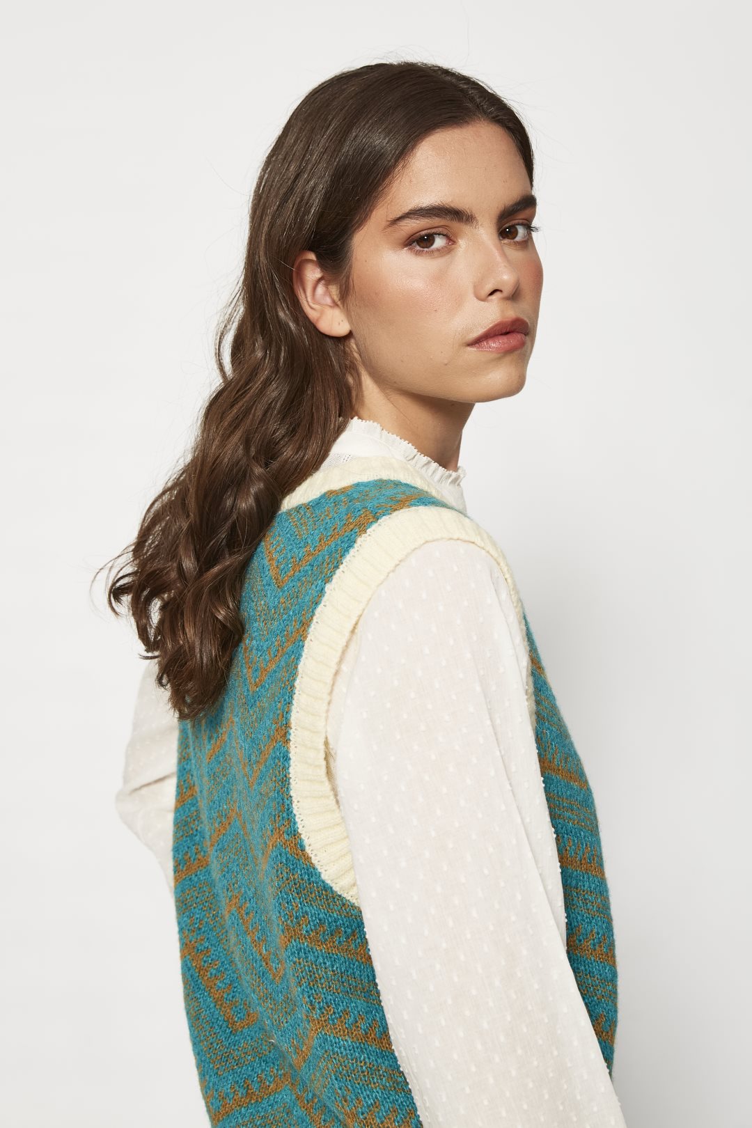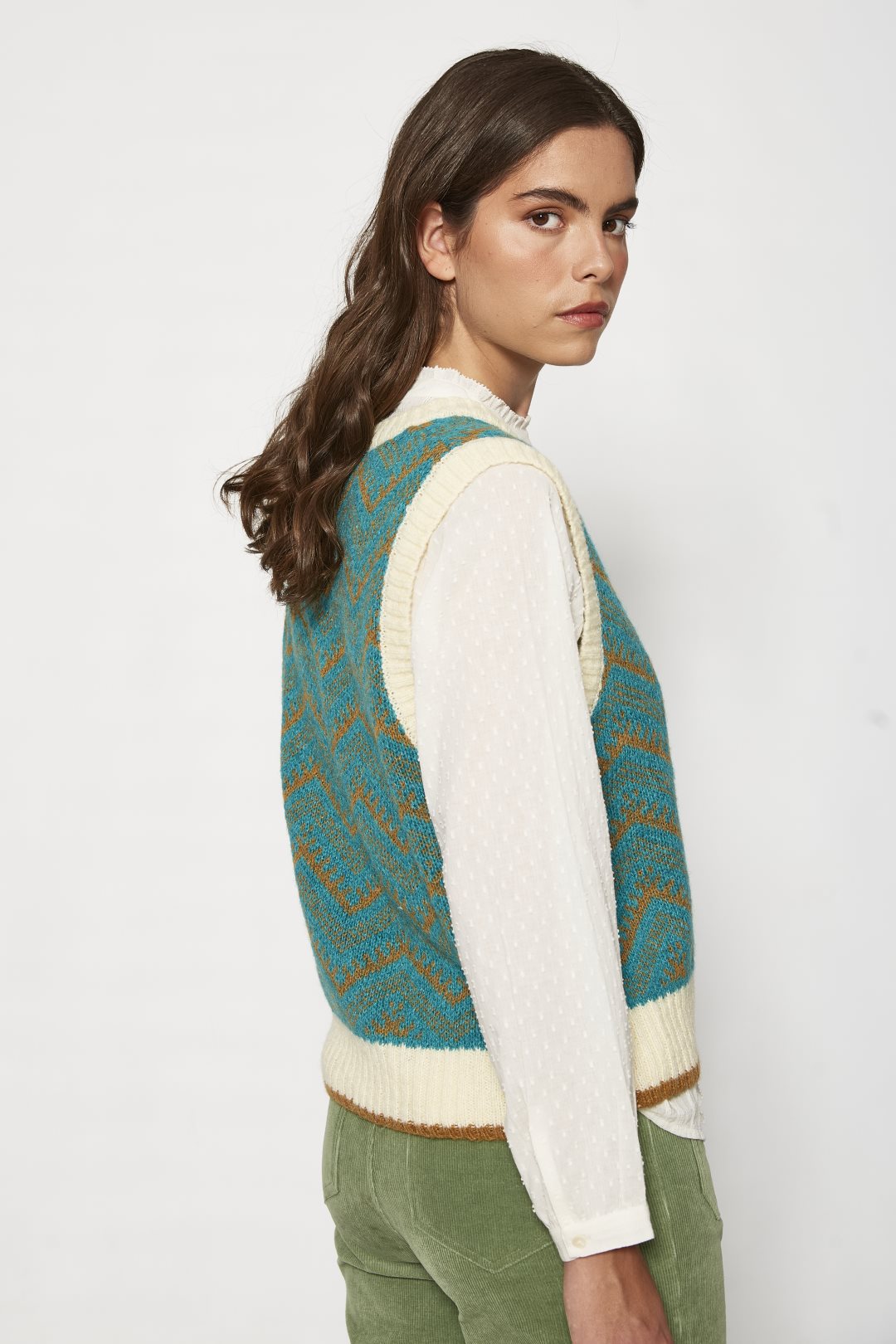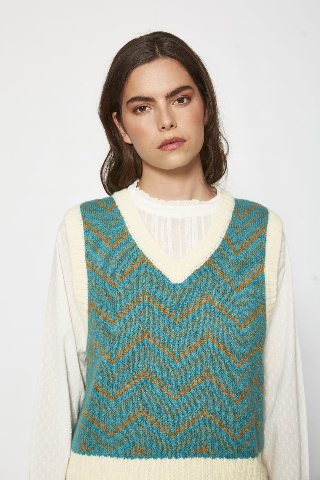 Chaleco sin mangas para mujer con cuello pico, confeccionado en tejido con estampado de zigzag bicolor. Presenta costuras a contraste que remarcan la estructura de la prenda y aportan un acabado visual distintivo. Diseño de estilo casual con inspiración retro, ideal para superponer sobre camisetas, camisas o vestidos durante la temporada otoño-invierno. Disponible en varias tallas.