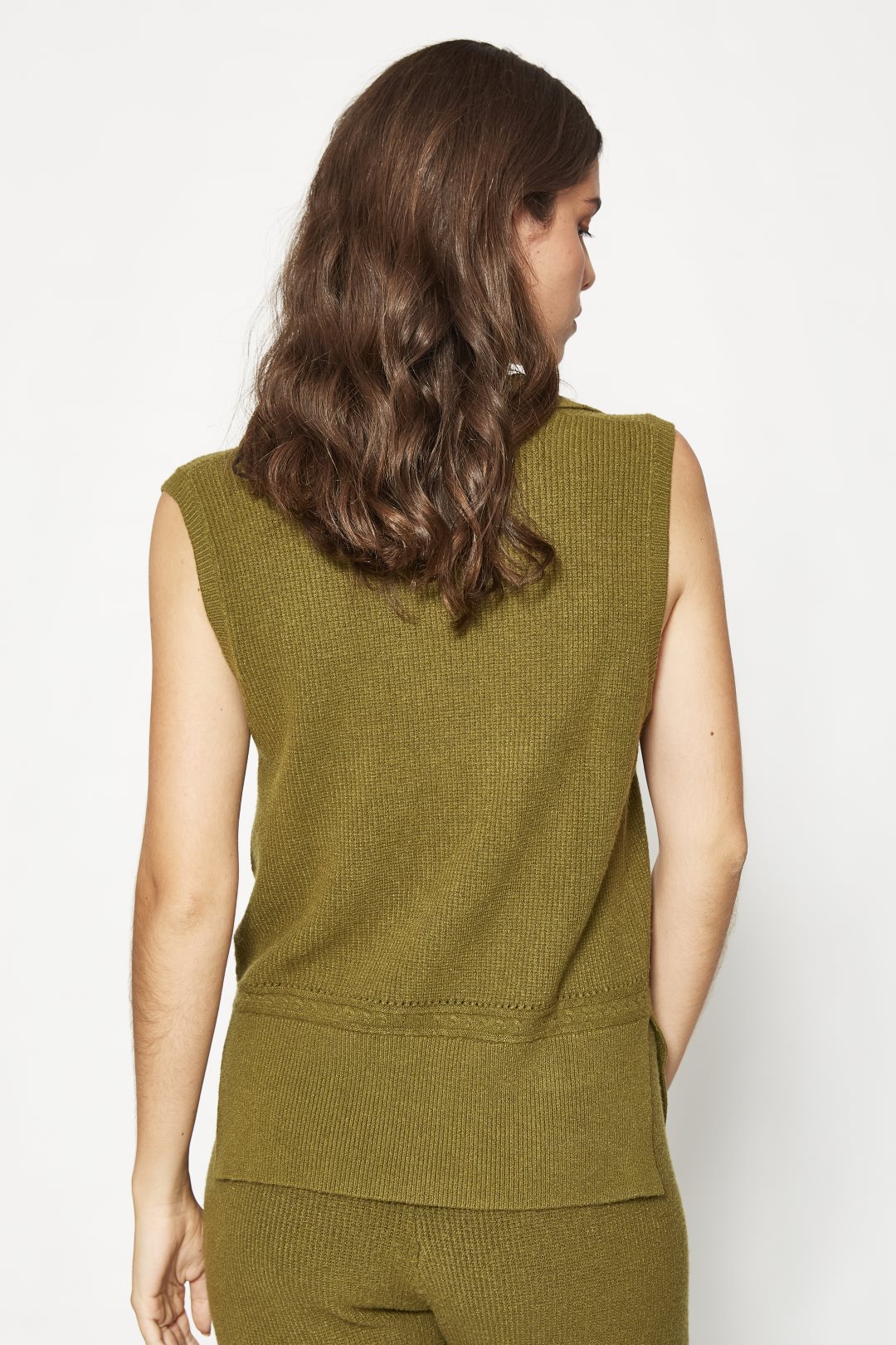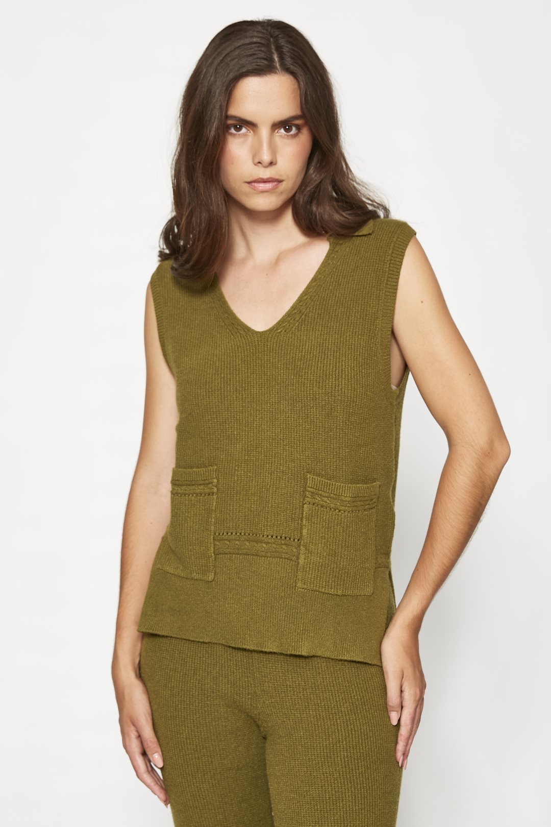 Chaleco de punto sin mangas con cuello tipo polo, solapas y escote en V. Dos bolsillos de parche frontales con detalle de punto calado. Cuerpo con estructura acanalada vertical. Bajo recto. Silueta de corte recto. Color caqui
