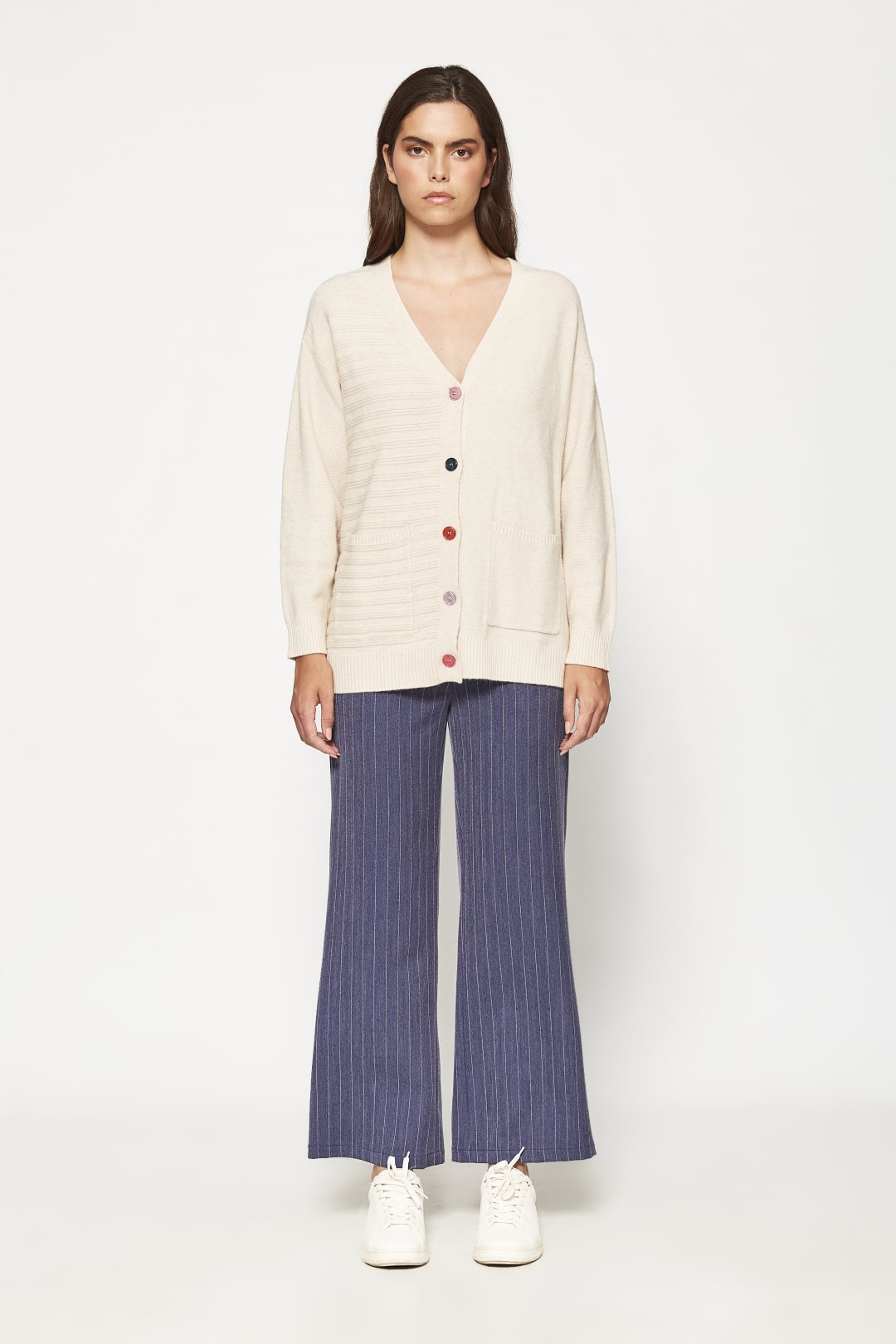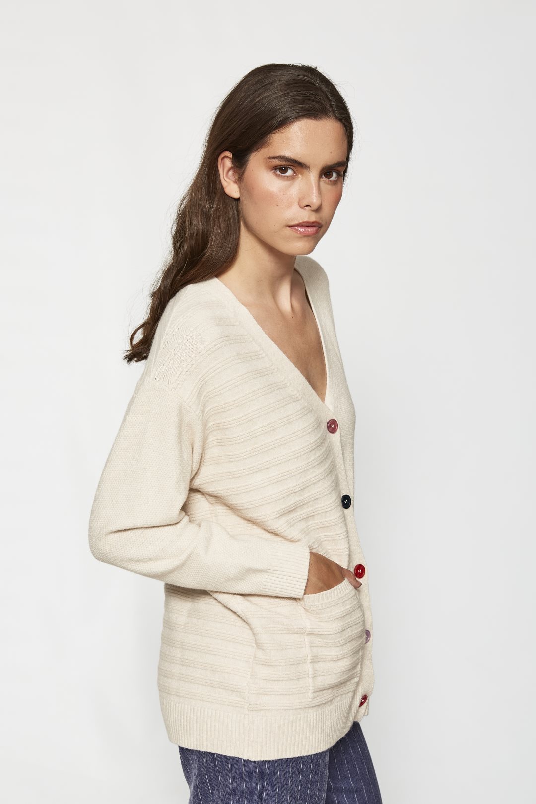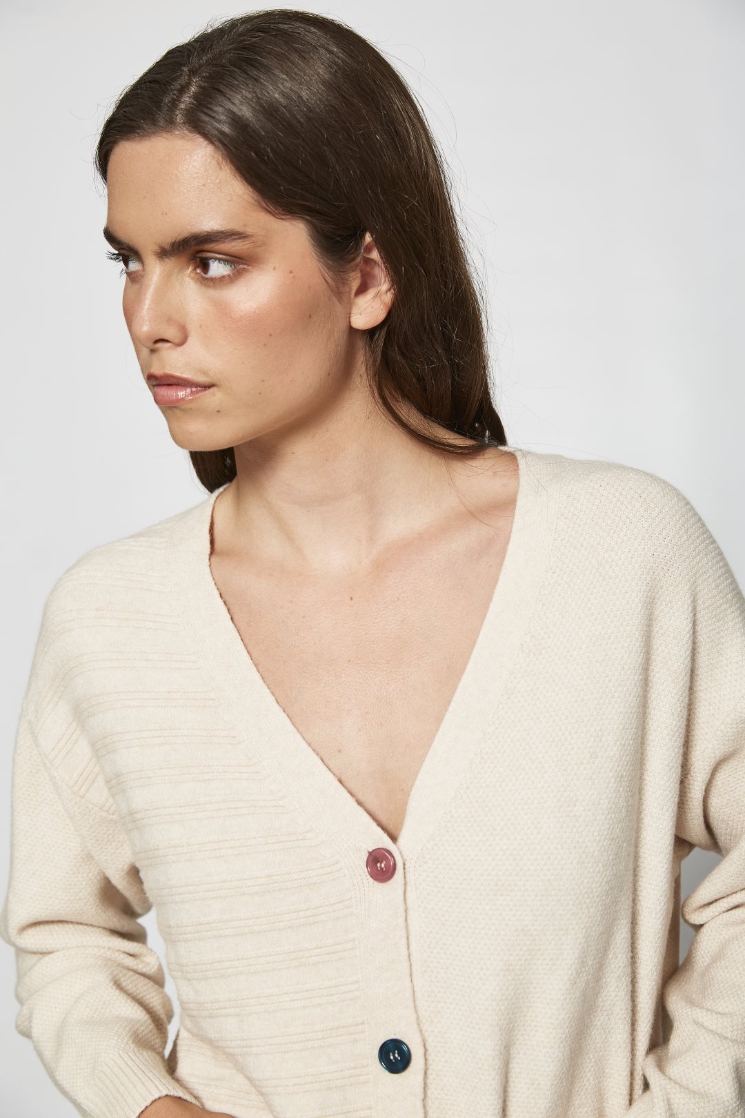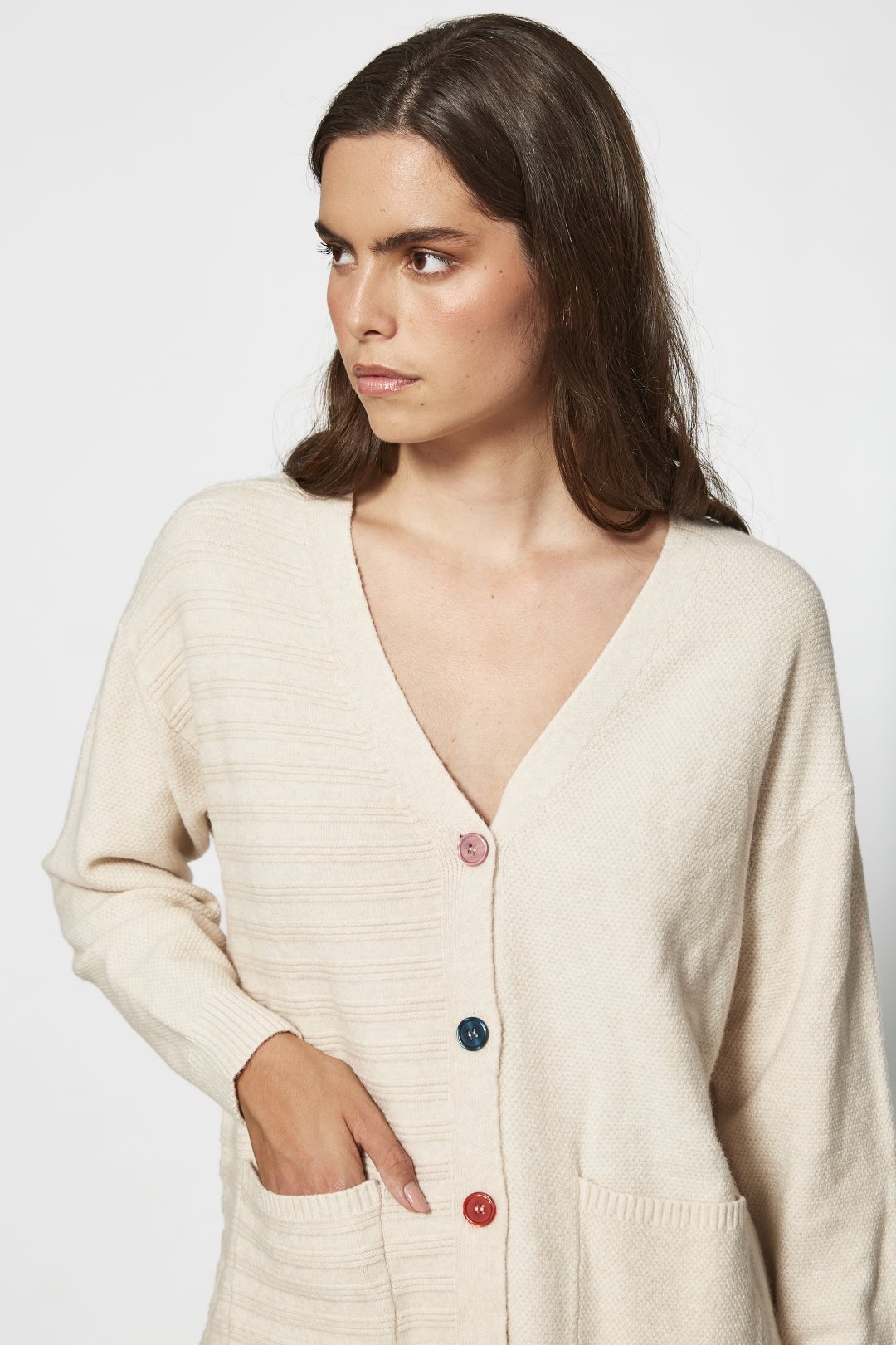 Chaqueta para mujer de la colección otoño-invierno de MD’M. Confeccionada en tejido de punto de arroz, presenta detalles de cambio de punto que aportan textura y contraste. Cierre frontal con botones multicolor y escote de pico para un diseño moderno y funcional. Prenda cálida y versátil, ideal para combinar con pantalones o faldas. Disponible en varias tallas.