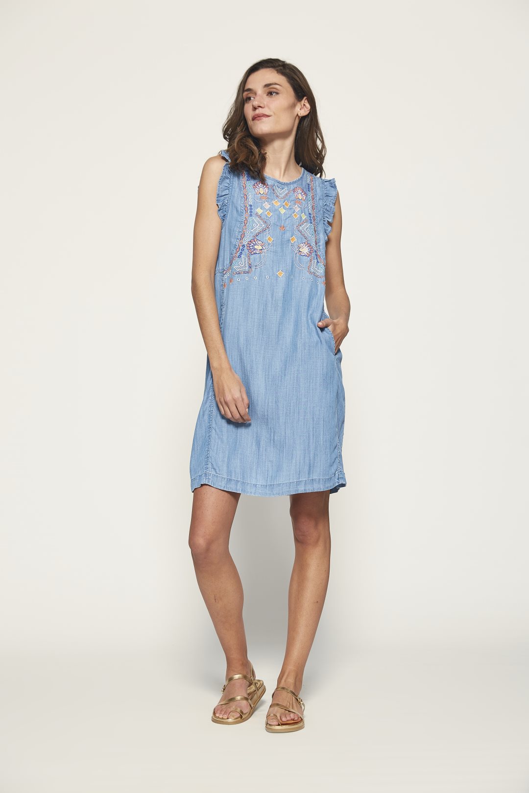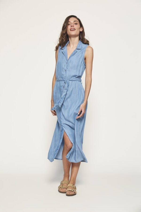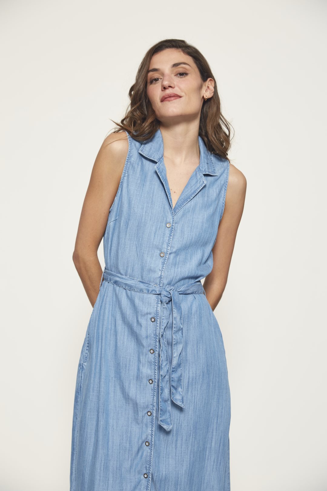 Vestido camisero largo de tencel, sin mangas, con cuello solapa y botones delanteros. Cinturón tipo lazada para un ajuste perfecto. Color azul