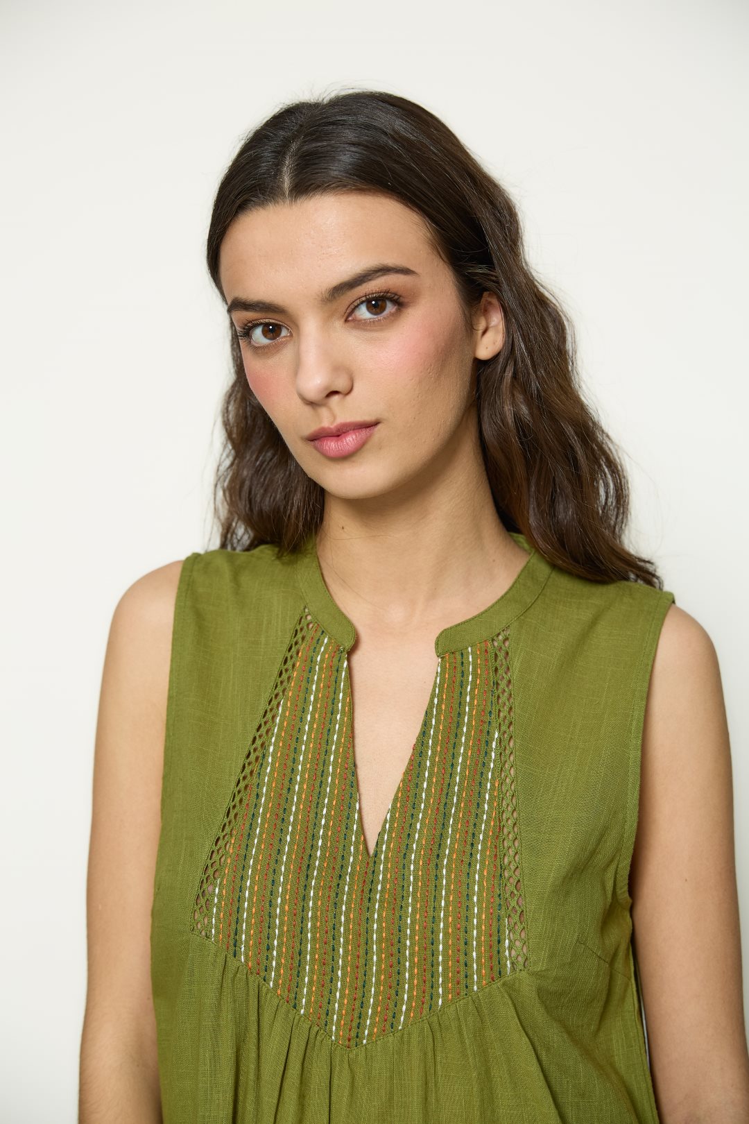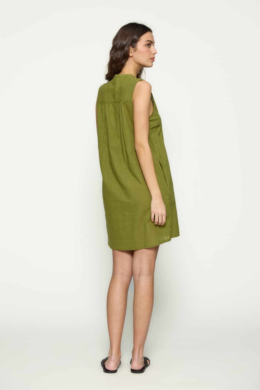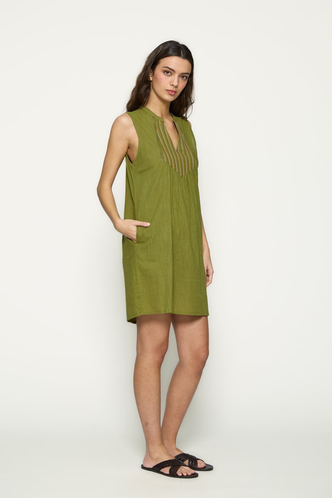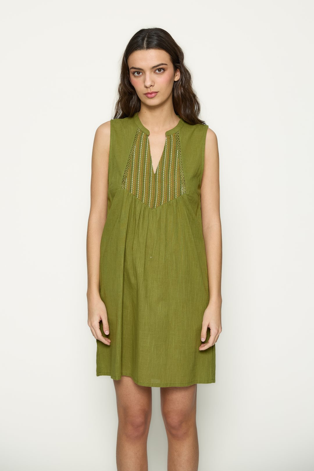 Vestido sin mangas con escote redondo y abertura en pico. Pechera bordada con detalle geométrico y ligeros pliegues frontales. Corte recto y acabado fluido. Color verde