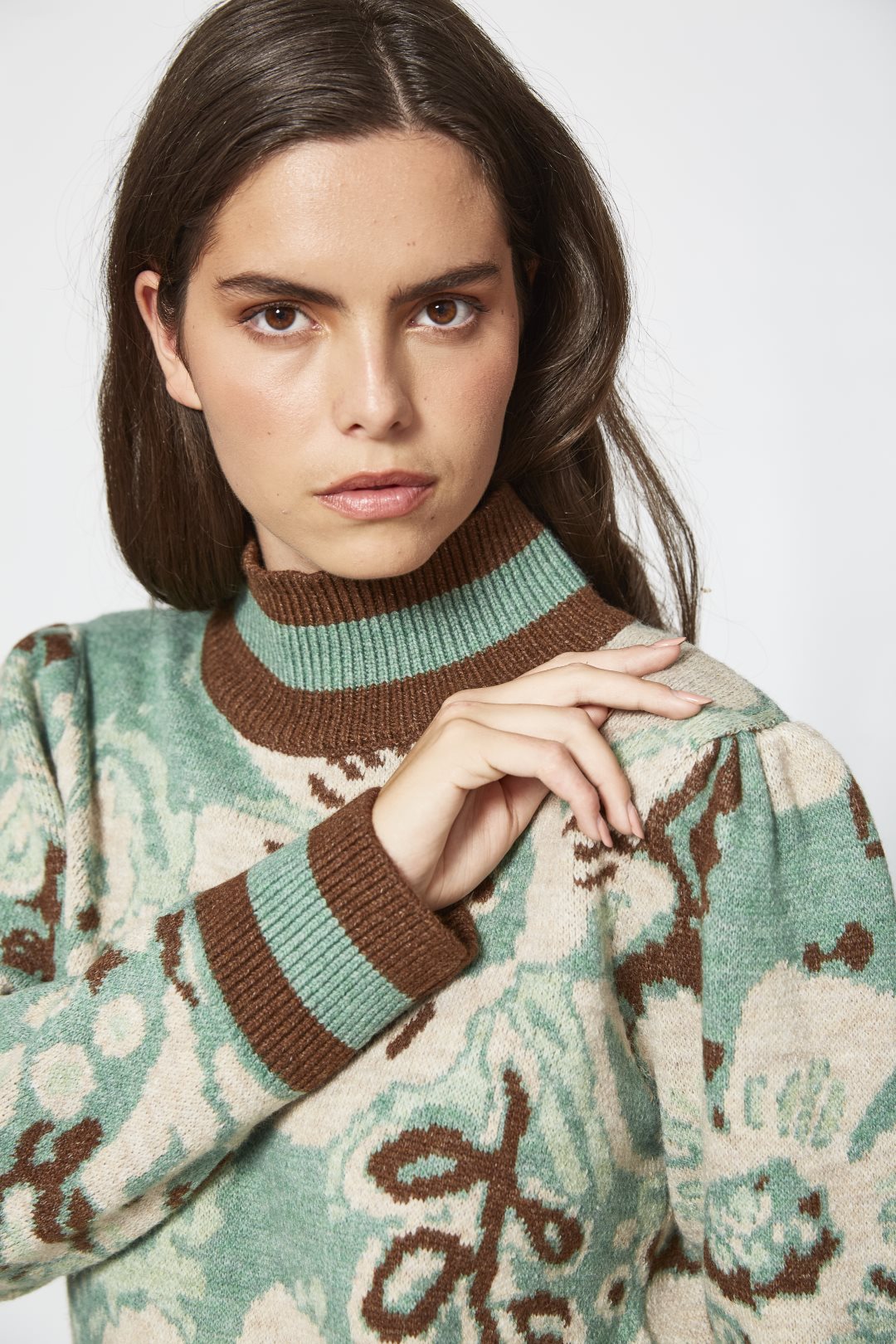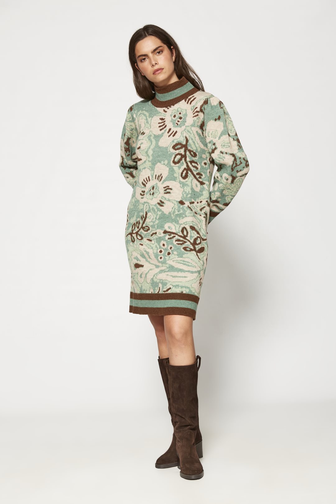 Vestido corto de punto cálido de lana con cuello redondo, manga larga y dibujo de flores paisley. Color verde