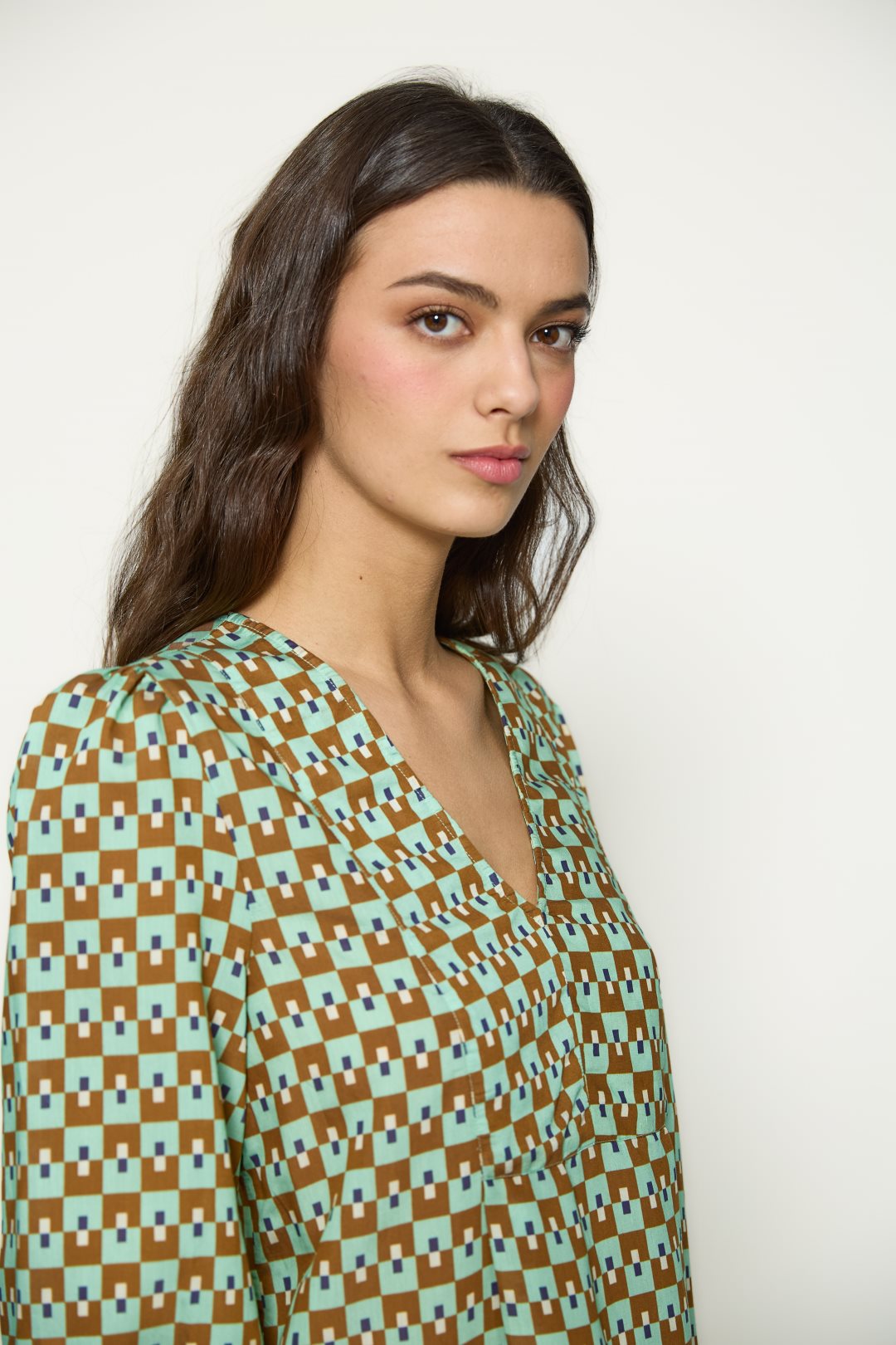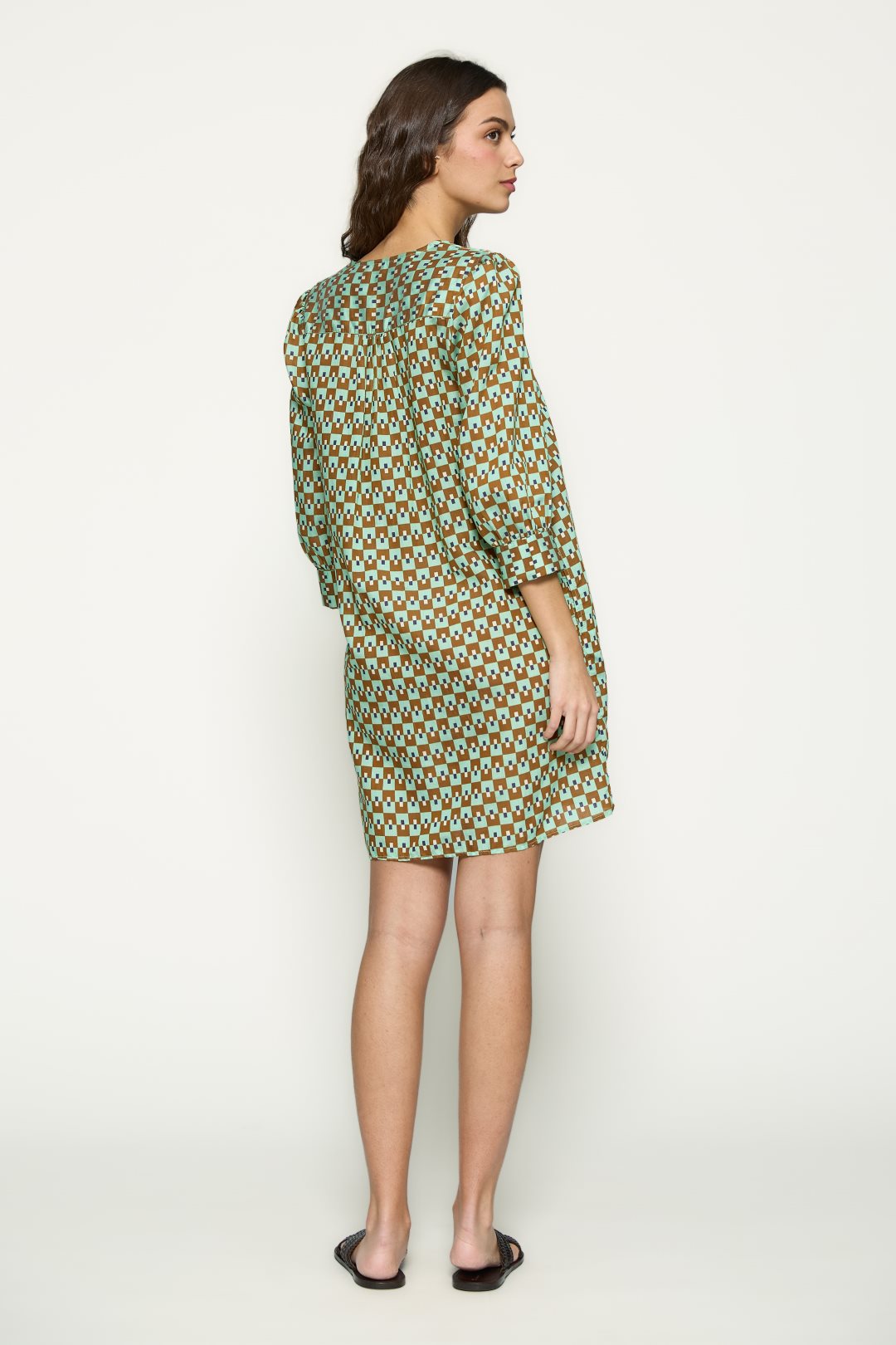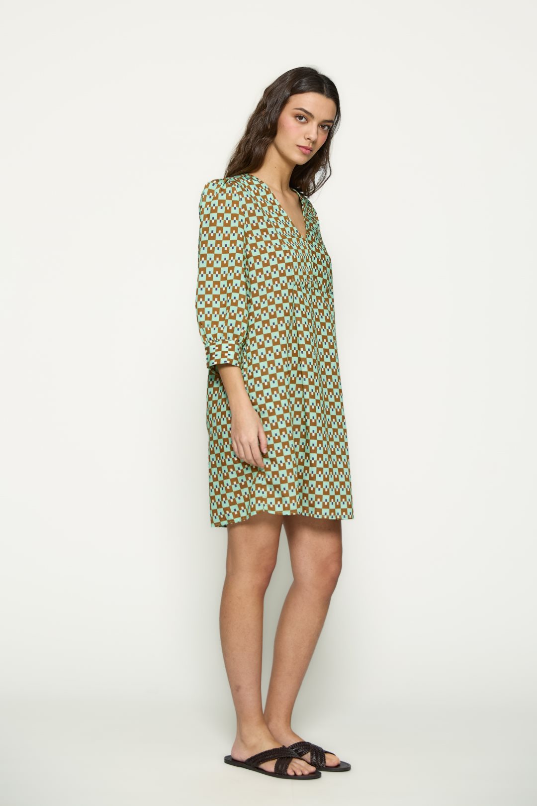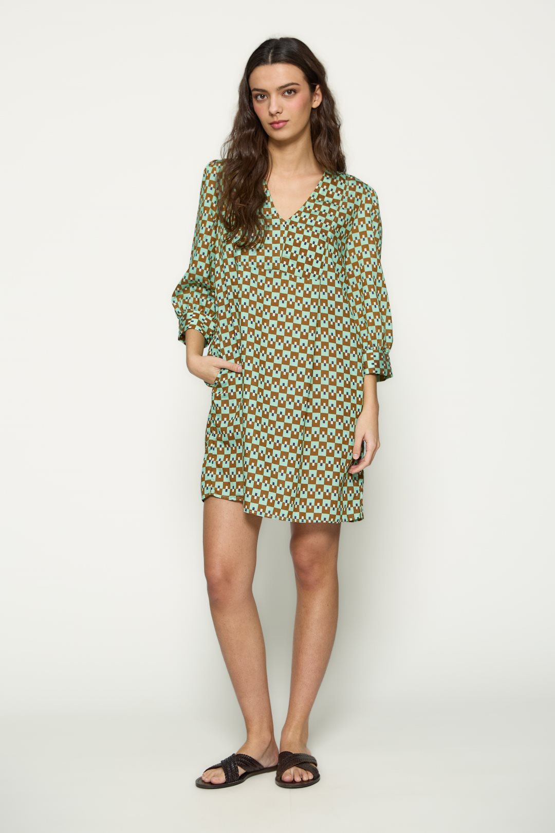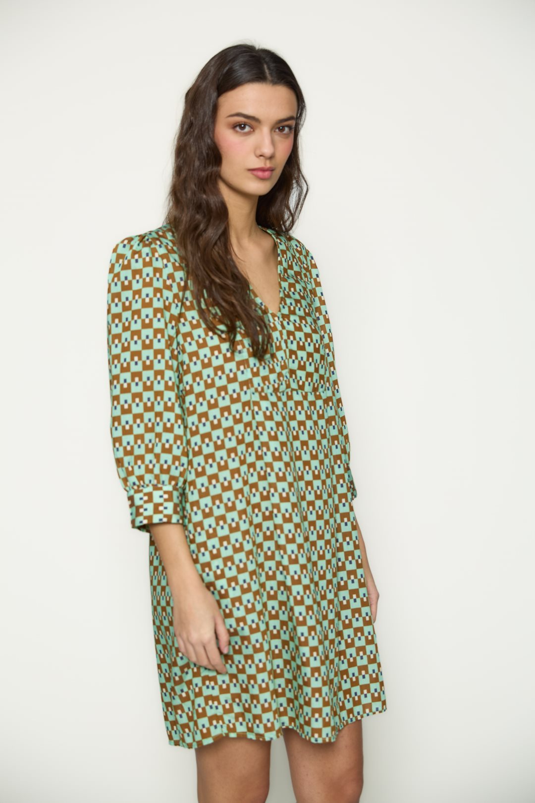 Vestido para mujer de la colección primavera-verano de MD’M. Confeccionado en una mezcla de viscosa (85 %) que aporta suavidad y fluidez, presenta un diseño con escote en pico, manga larga acabada en puño con botón y estampado geométrico de inspiración retro. Su silueta suelta y ligera ofrece comodidad y movimiento. Una prenda versátil y favorecedora, ideal para looks de día con un toque moderno. Disponible en varias tallas.