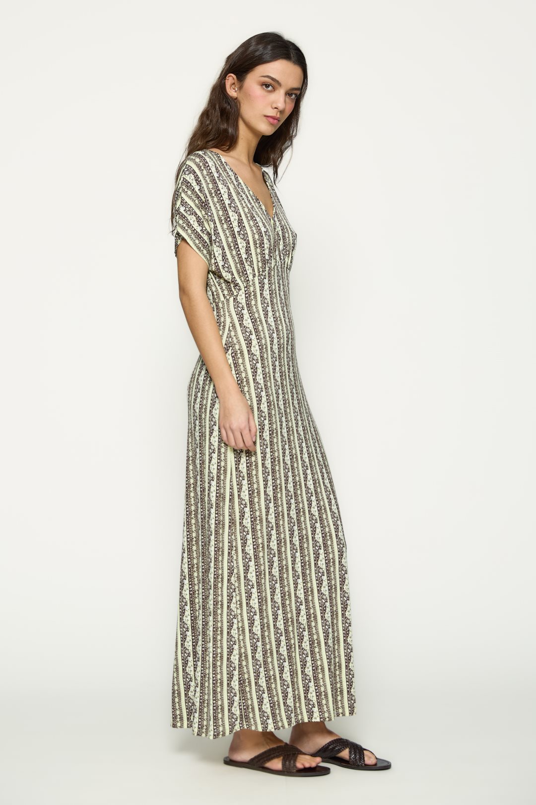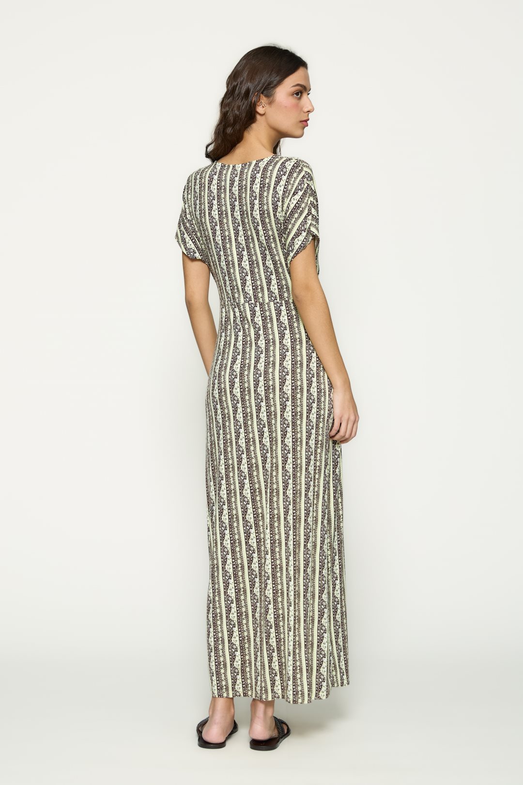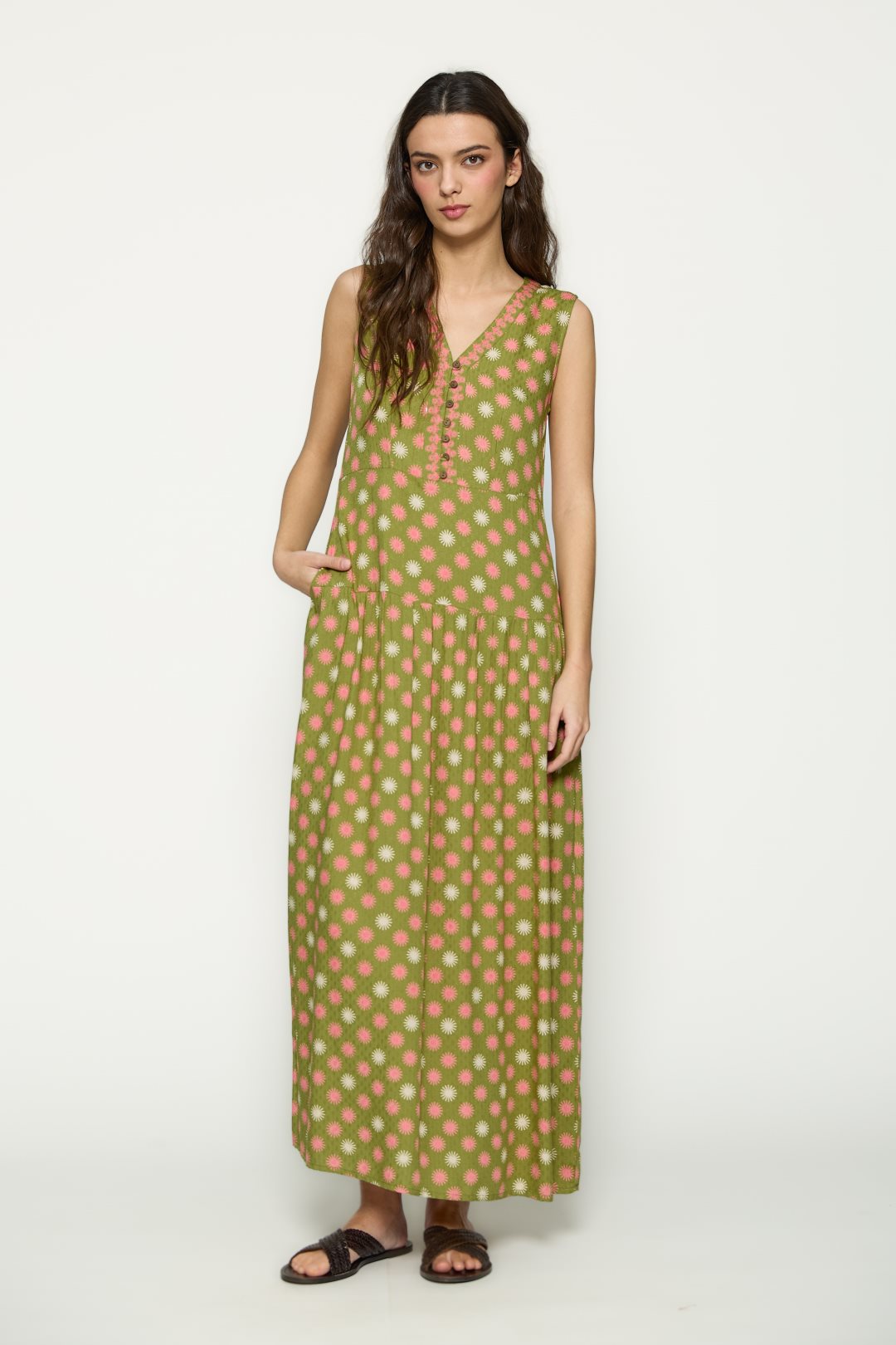 Vestido para mujer de la colección primavera-verano de MD’M. Confeccionado en punto de viscosa elástico, presenta un estampado geométrico de inspiración artesanal que alarga visualmente la silueta. De escote en pico, manga corta fluida y corte largo, ofrece una caída ligera y favorecedora que aporta movimiento y comodidad. Ideal para looks casuales o de viaje, gracias a su tejido fresco y suave al tacto. Disponible en varias tallas.