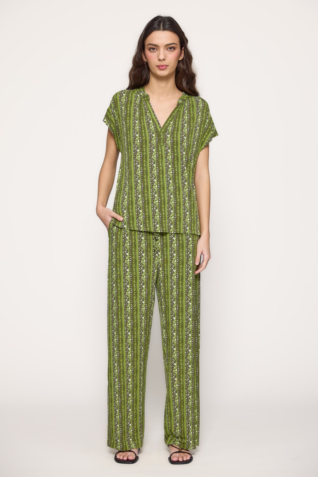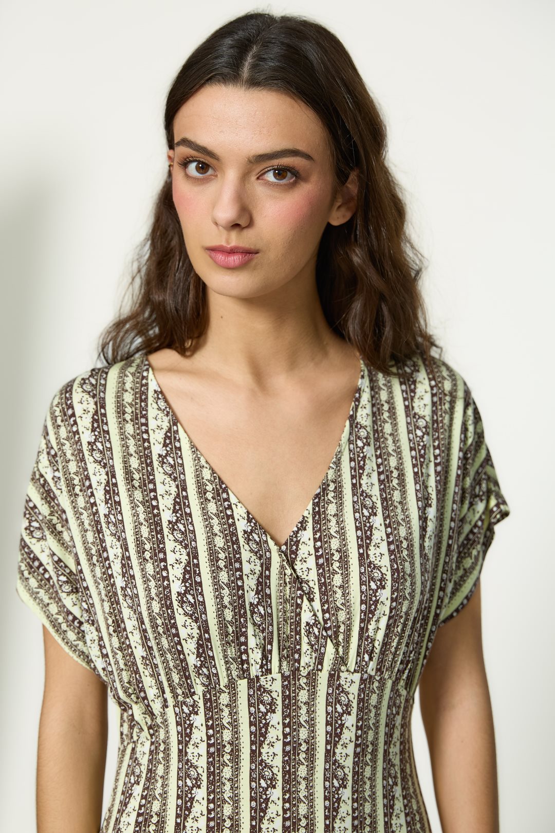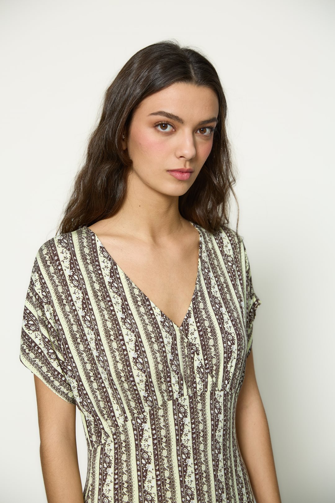 Vestido para mujer de la colección primavera-verano de MD’M. Confeccionado en punto de viscosa elástico, presenta un estampado geométrico de inspiración artesanal que alarga visualmente la silueta. De escote en pico, manga corta fluida y corte largo, ofrece una caída ligera y favorecedora que aporta movimiento y comodidad. Ideal para looks casuales o de viaje, gracias a su tejido fresco y suave al tacto. Disponible en varias tallas.