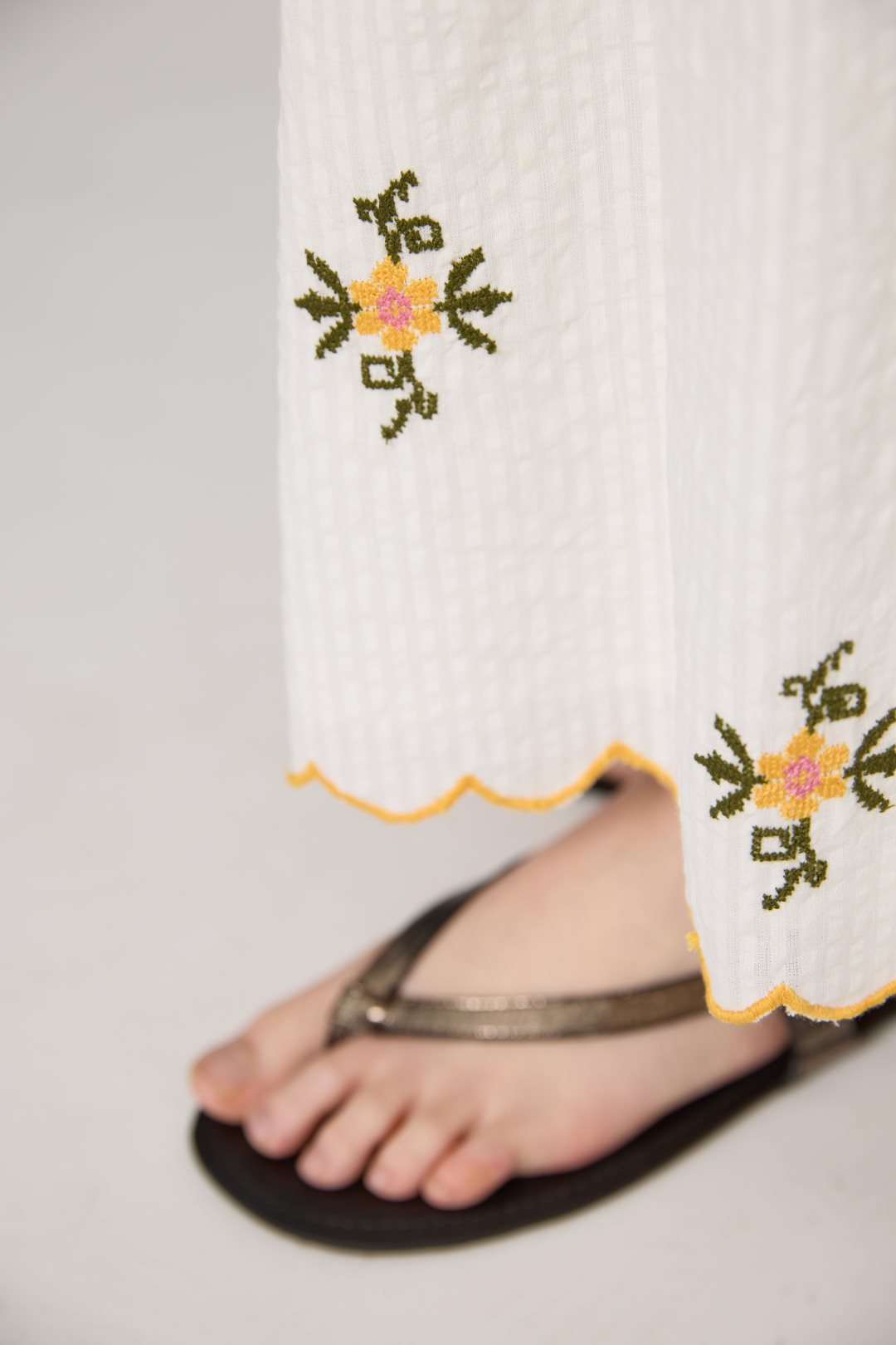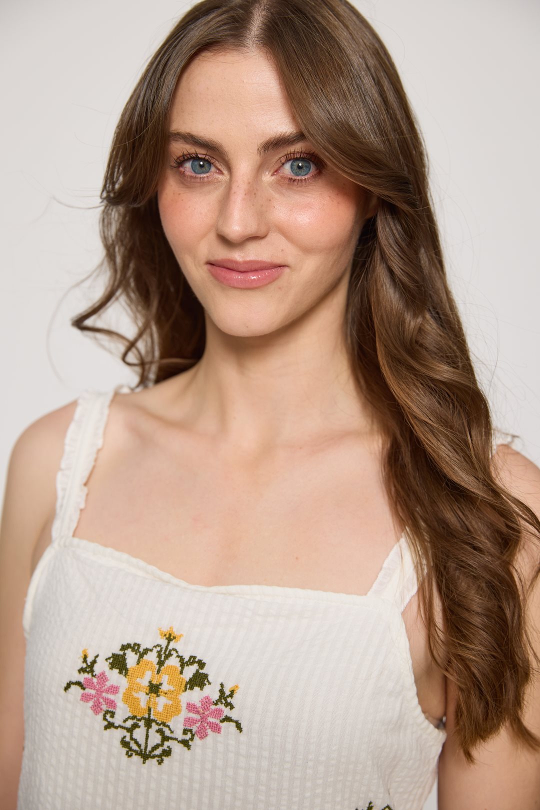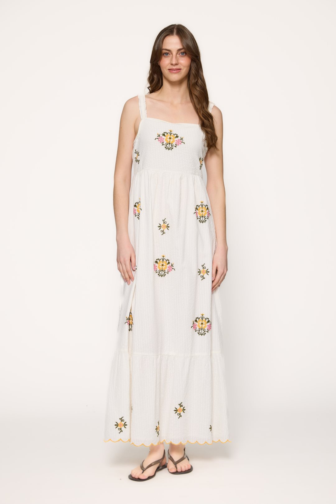 Vestido para mujer de la colección primavera-verano de MD’M. Confeccionado en tejido 100 % algodón, combina ligereza y frescura con un estilo artesanal. Presenta escote recto con tirantes anchos adornados con volantes, bordados florales multicolor distribuidos por toda la prenda y bajo con volante festoneado. Su silueta amplia y fluida lo convierte en una opción cómoda y femenina para los días de verano. Disponible en varias tallas.