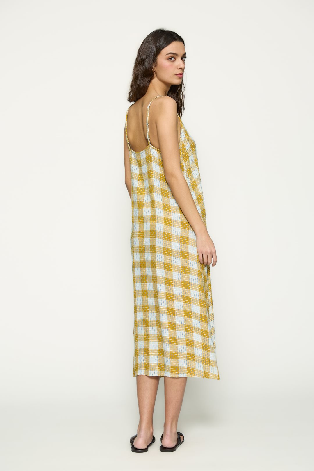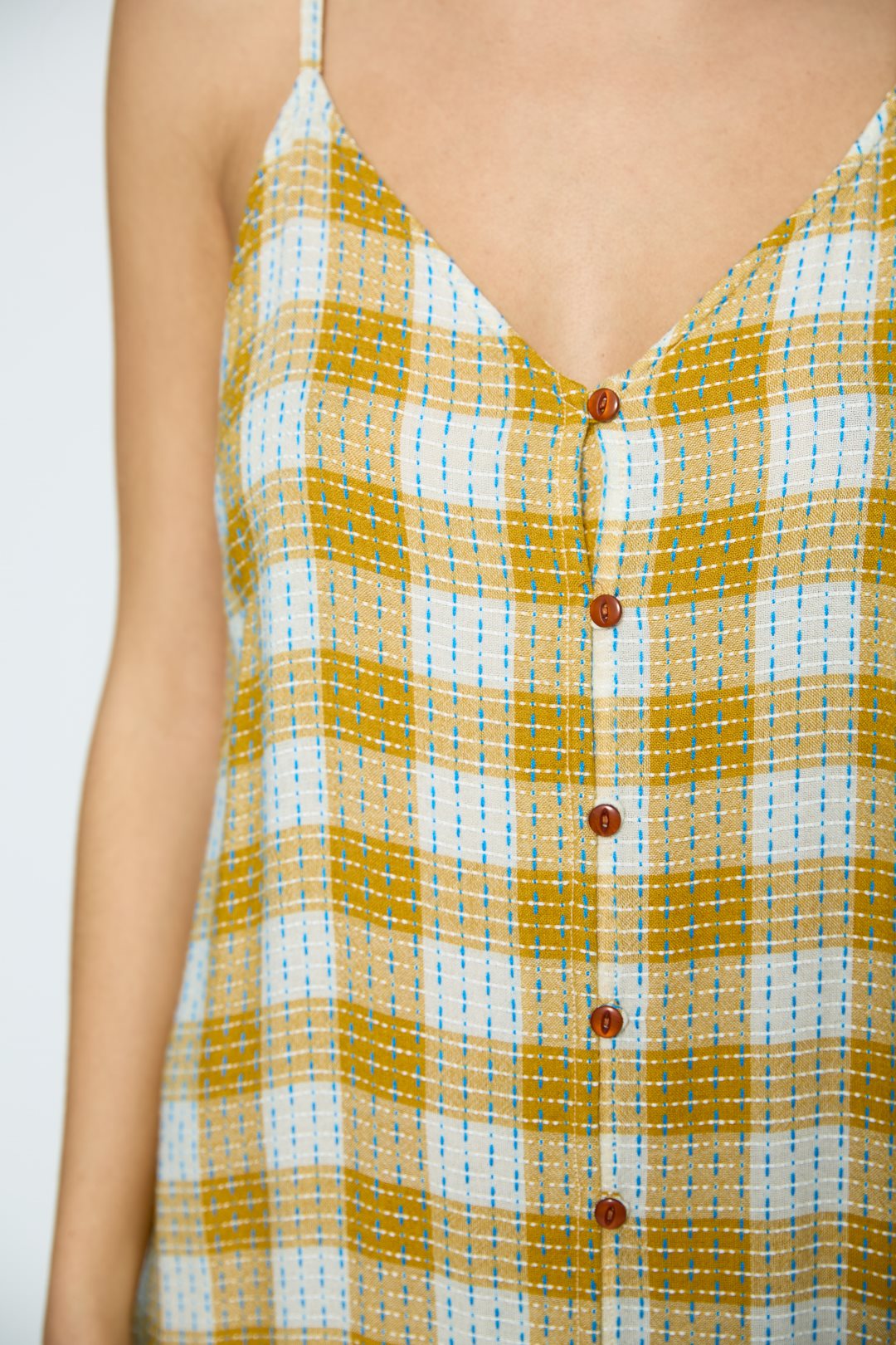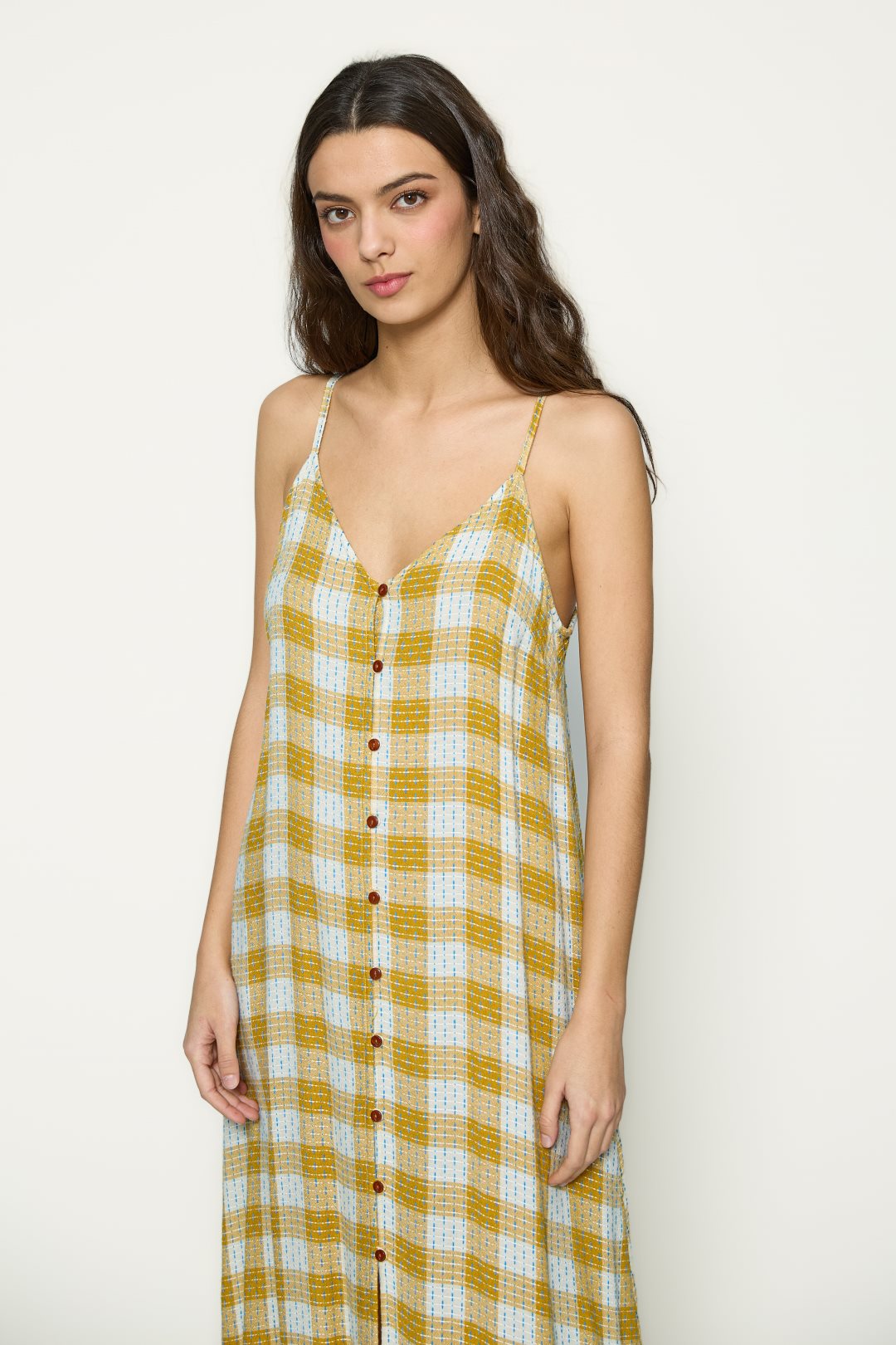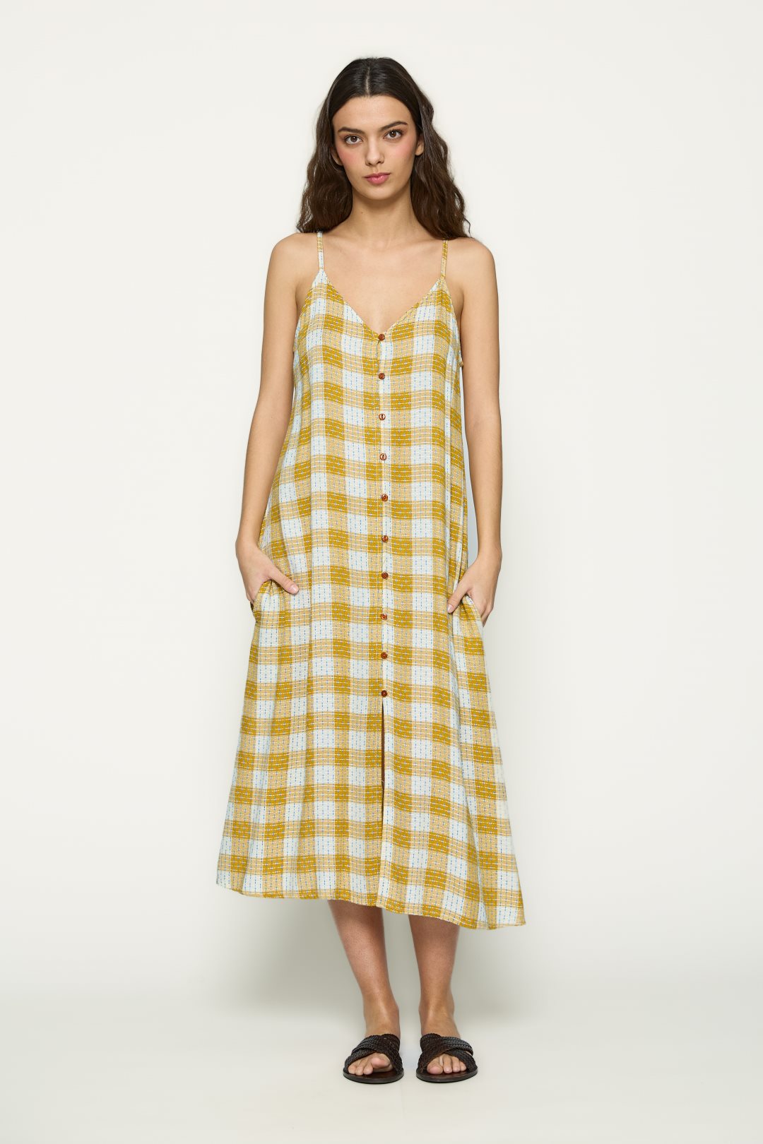 Vestido para mujer de la colección primavera-verano de MD’M. Confeccionado en tejido 100 % viscosa, combina ligereza y frescura con una caída natural. Presenta un diseño de tirantes finos, escote en pico y cierre frontal con botones. El estampado de cuadros aporta un aire veraniego y desenfadado, mientras que su silueta fluida garantiza comodidad y movimiento. Una prenda perfecta para los días cálidos o para llevar en looks de vacaciones. Disponible en varias tallas.