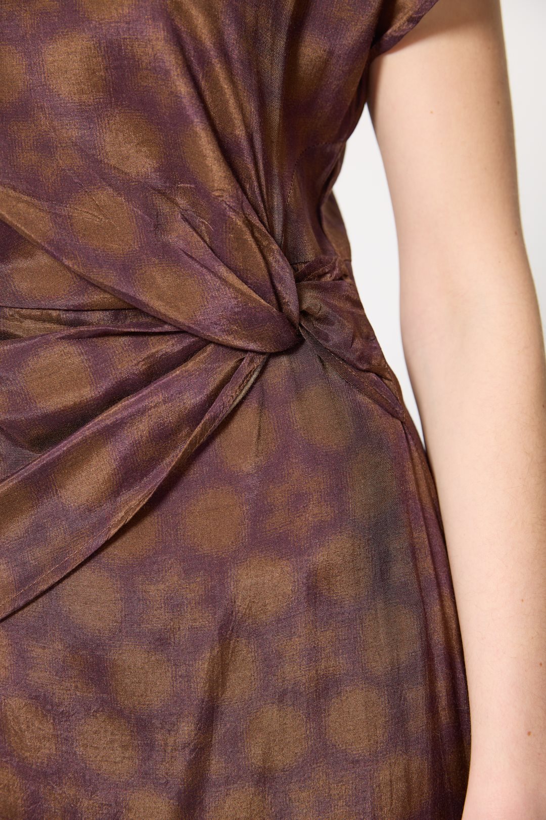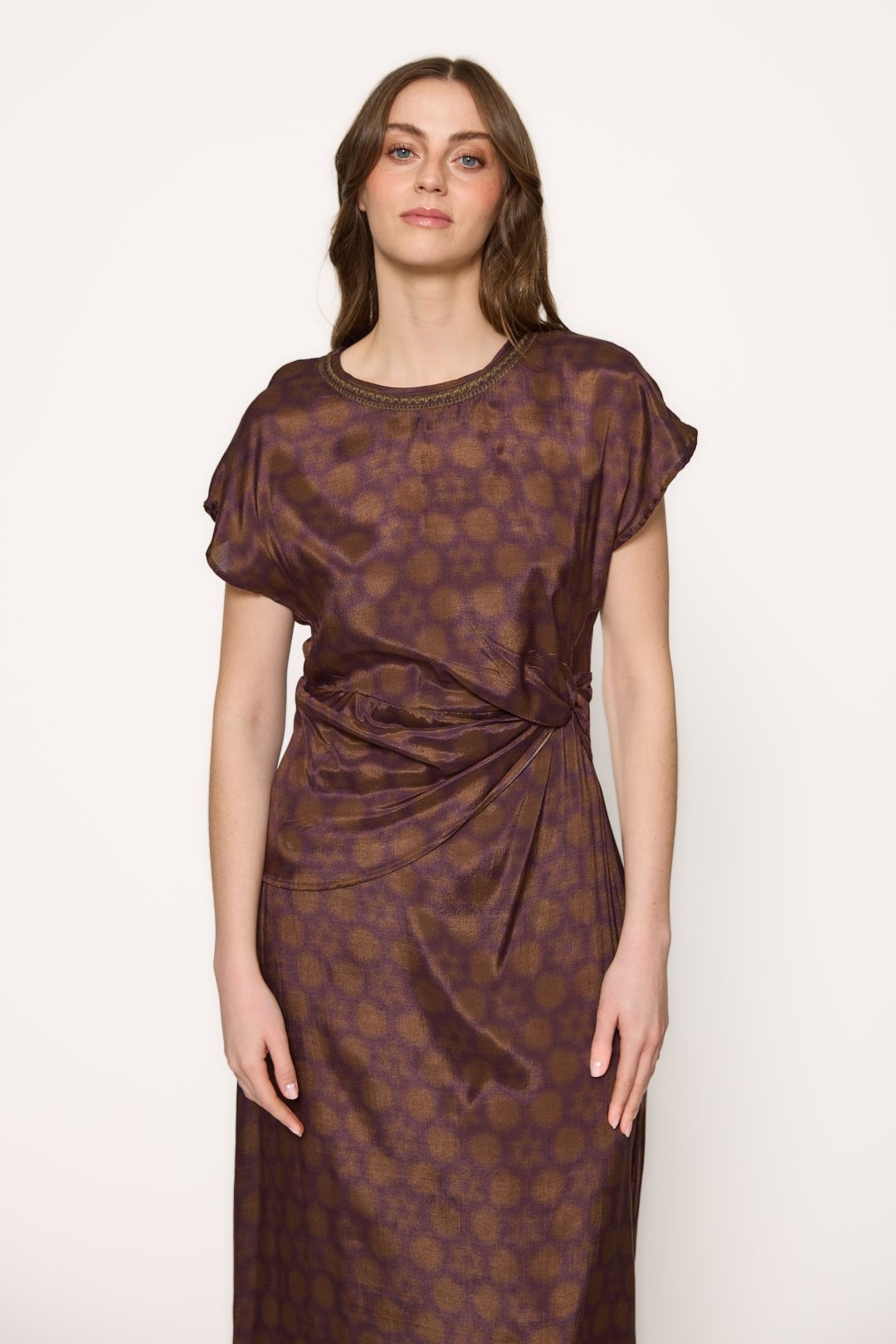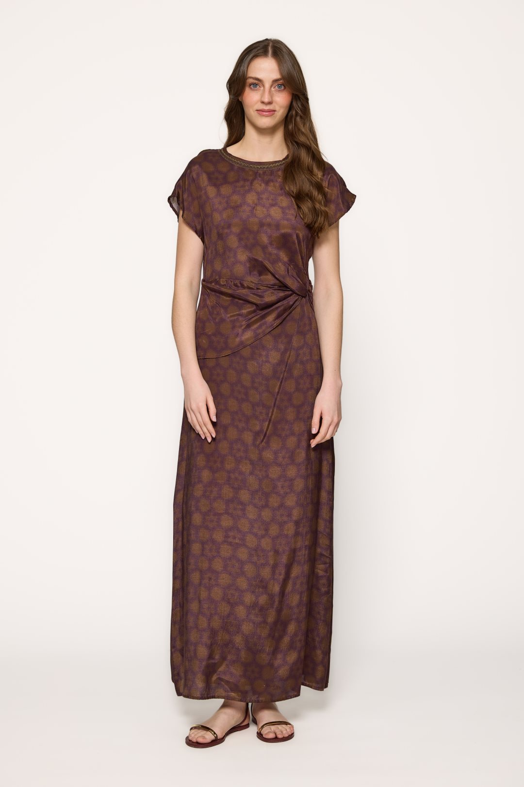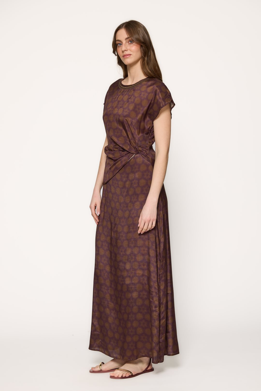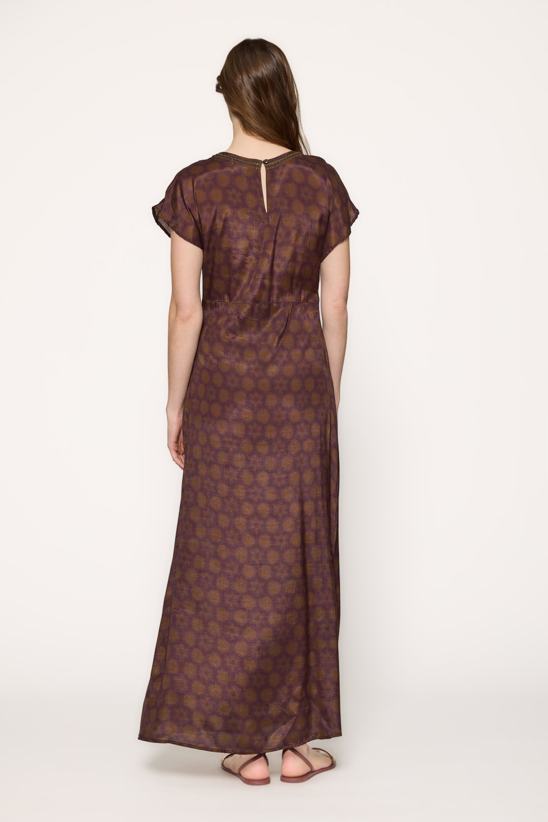Vestido largo de viscosa de corte recto y holgado. Cuenta con un cuello redondo adornado con pedrería y mangas cortas drapeadas. Presenta un detalle cruzado en la cintura que se anuda en el lateral y una apertura lateral en la falda que le da movimiento. El vestido tiene un estampado de motivos geométricos en tonos marrones.