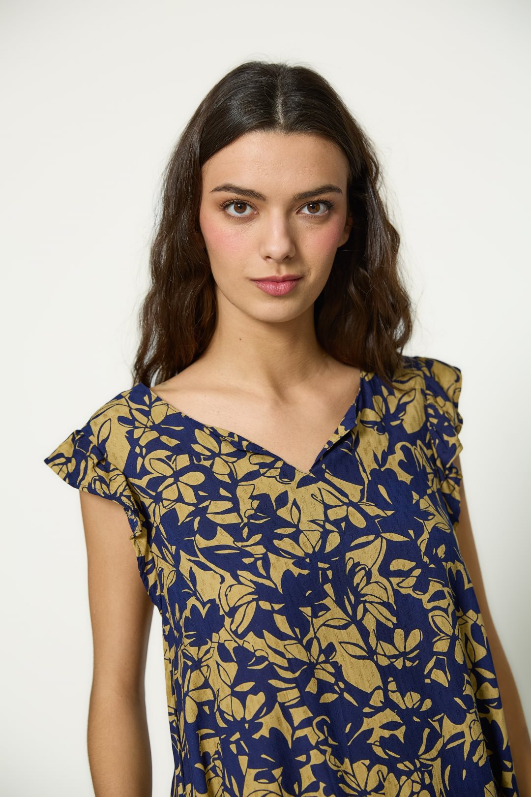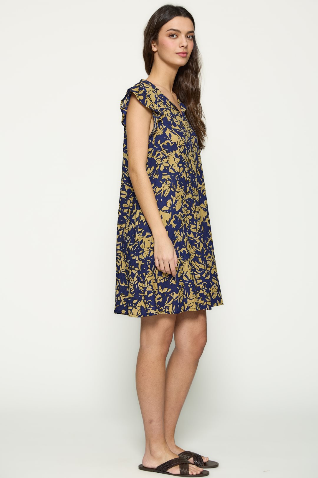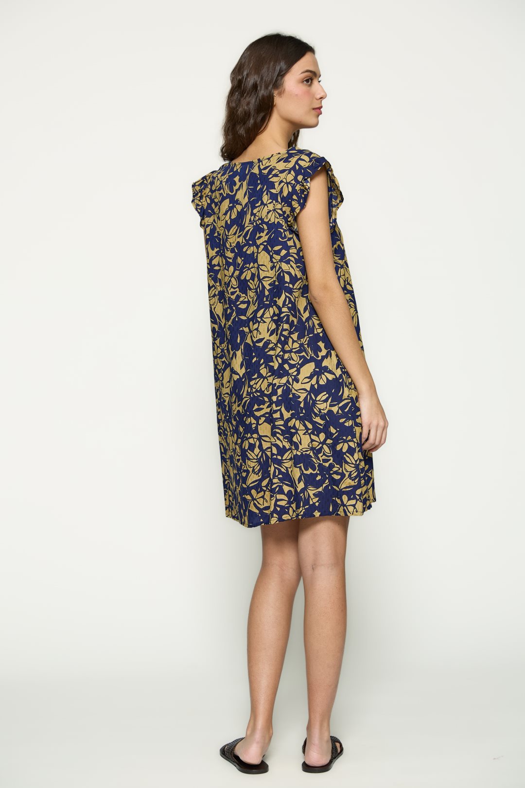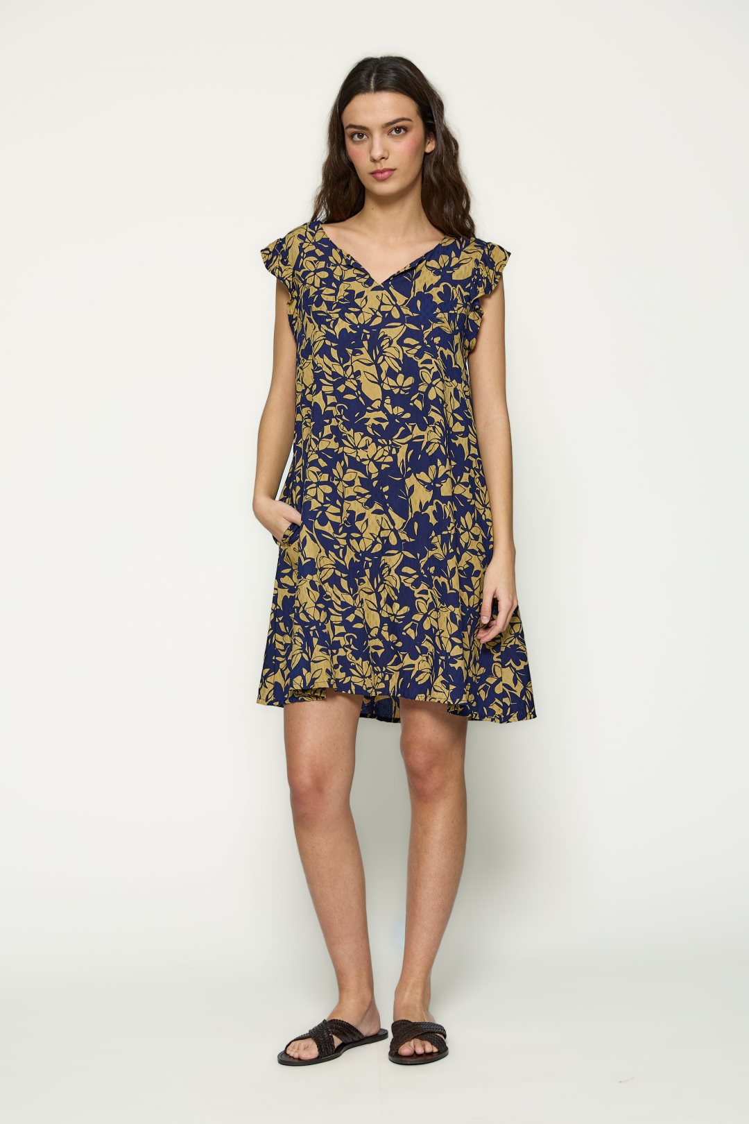 Vestido para mujer de la colección primavera-verano de MD’M. Confeccionado en tejido 100% viscosa, ofrece una textura ligera y una caída natural. Presenta escote redondo, sin mangas y estampado floral bicolor que aporta un estilo fresco y versátil. Su silueta fluida y el detalle de abertura en el bajo garantizan comodidad y movimiento. Disponible en varias tallas.