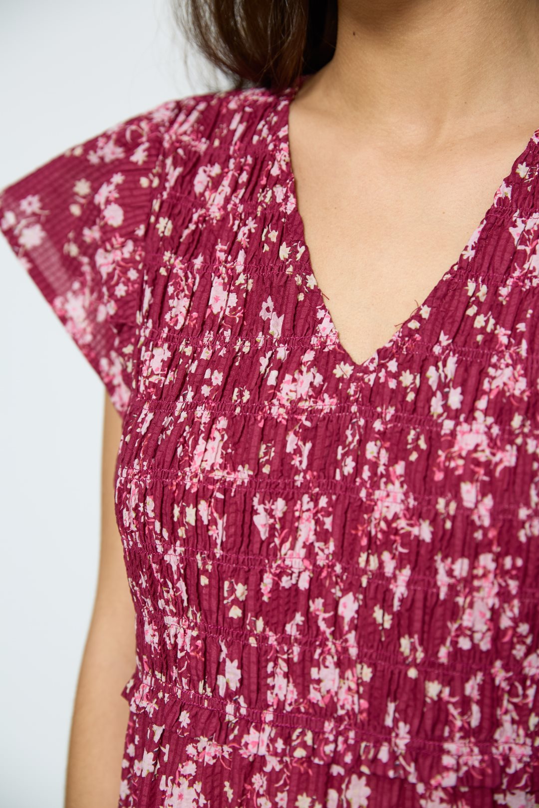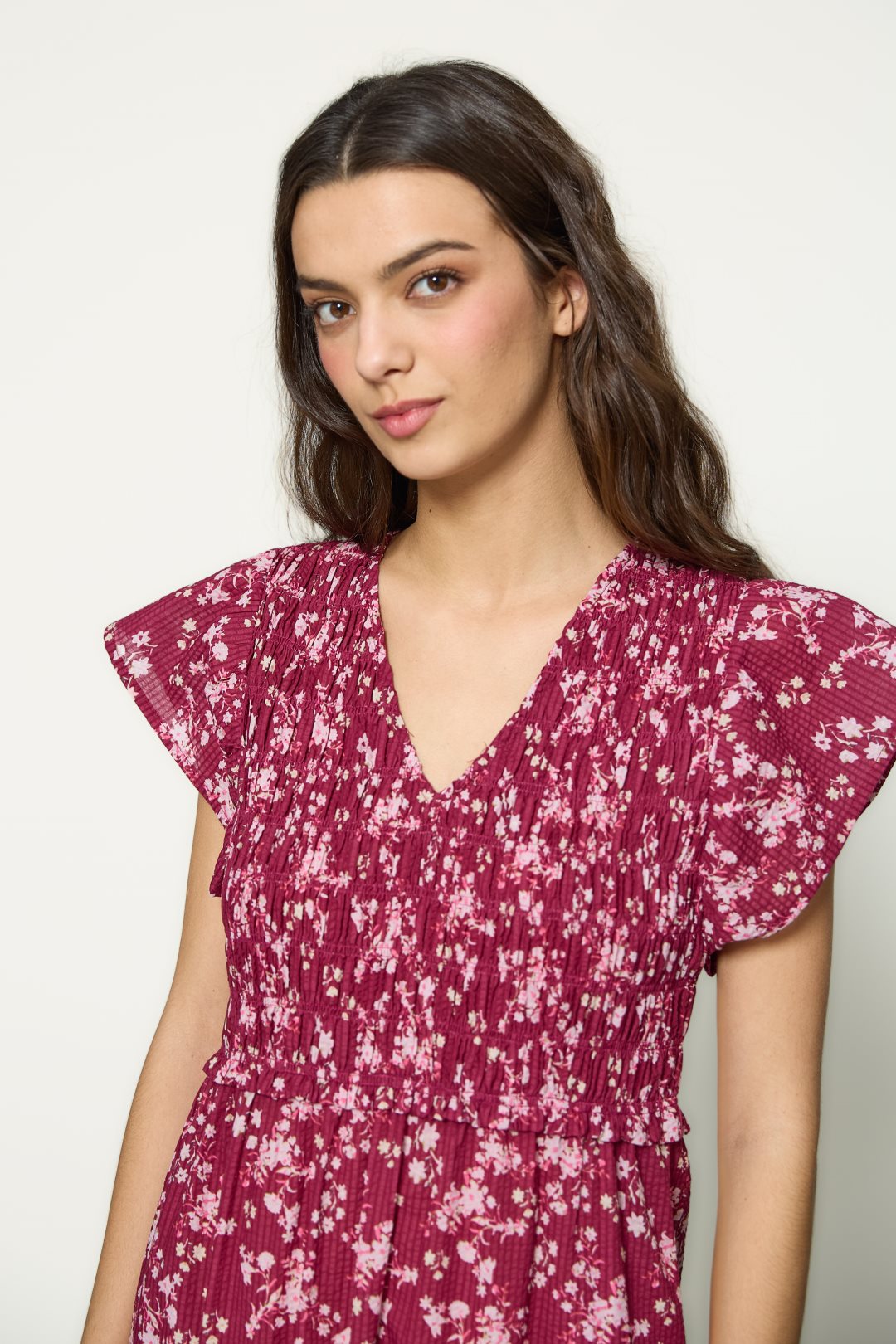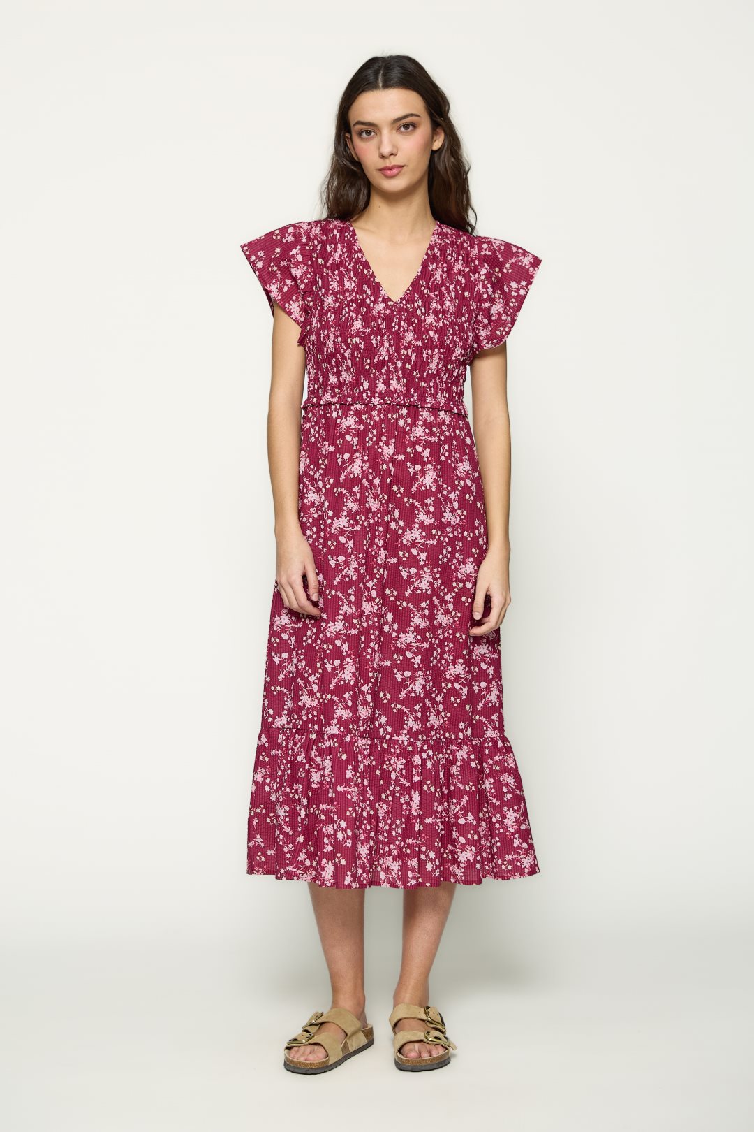 Vestido es una pieza midi de inspiración romántica, confeccionada en un tejido ligero que se adapta con suavidad al movimiento. Su color rojo intenso sirve como base vibrante para un estampado floral diminuto en tono blanco, creando un contraste delicado que aporta frescura y un aire primaveral.